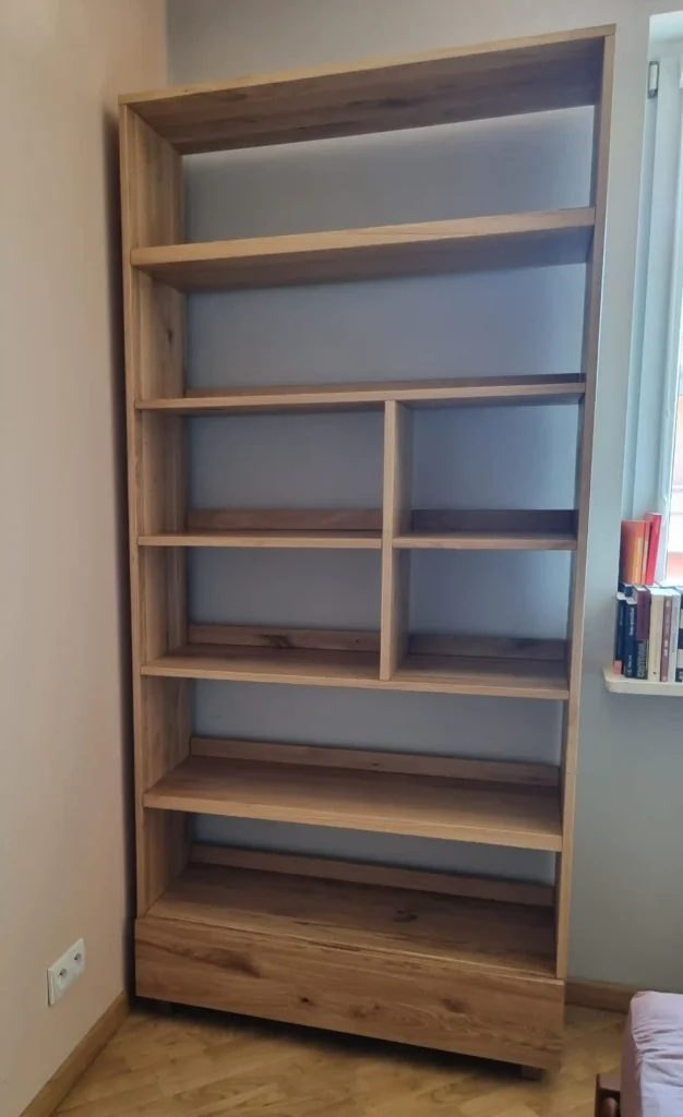 - Dębowy regał na książki: Regały są jednym z najpopularniejszych mebli do przechowywania książek. Dostępne są w różnych rozmiarach, stylach i konfiguracjach, dzięki czemu łatwo dopasować je do Twoich potrzeb. Regały mogą być otwarte lub z zamkniętymi półkami, przeszklone lub drewniane. Mogą być również wolnostojące lub zamocowane na ścianie, co jest idealne, jeśli masz ograniczoną przestrzeń.