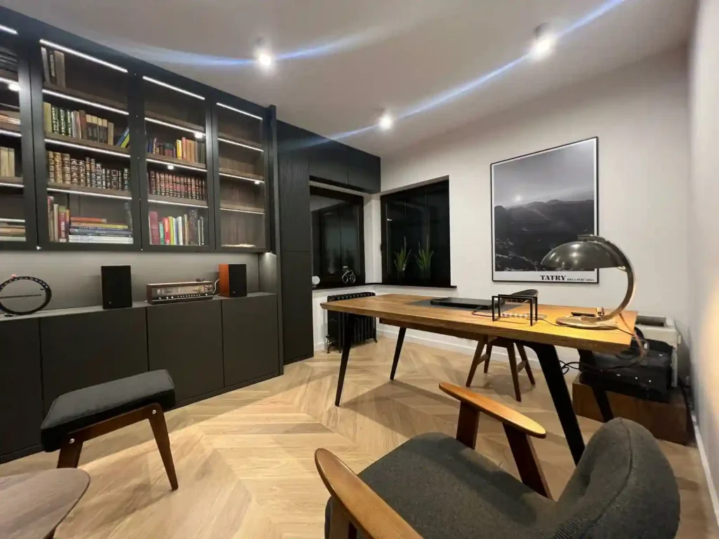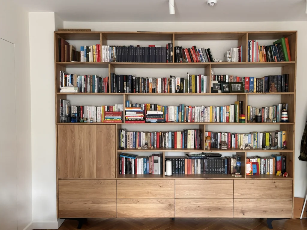 Kompleksowe realizacje: biurko + regały + komody + zabudowy ścienne. To najlepsza opcja, jeśli zależy Ci na spójności stylu oraz maksymalnym wykorzystaniu przestrzeni.