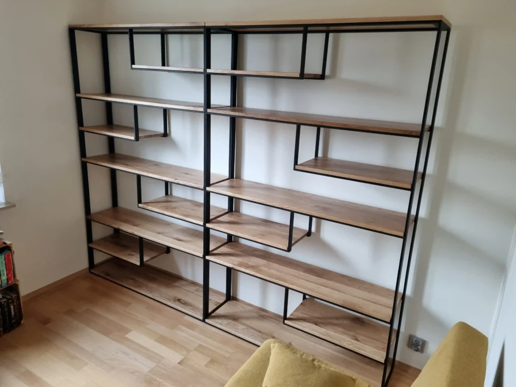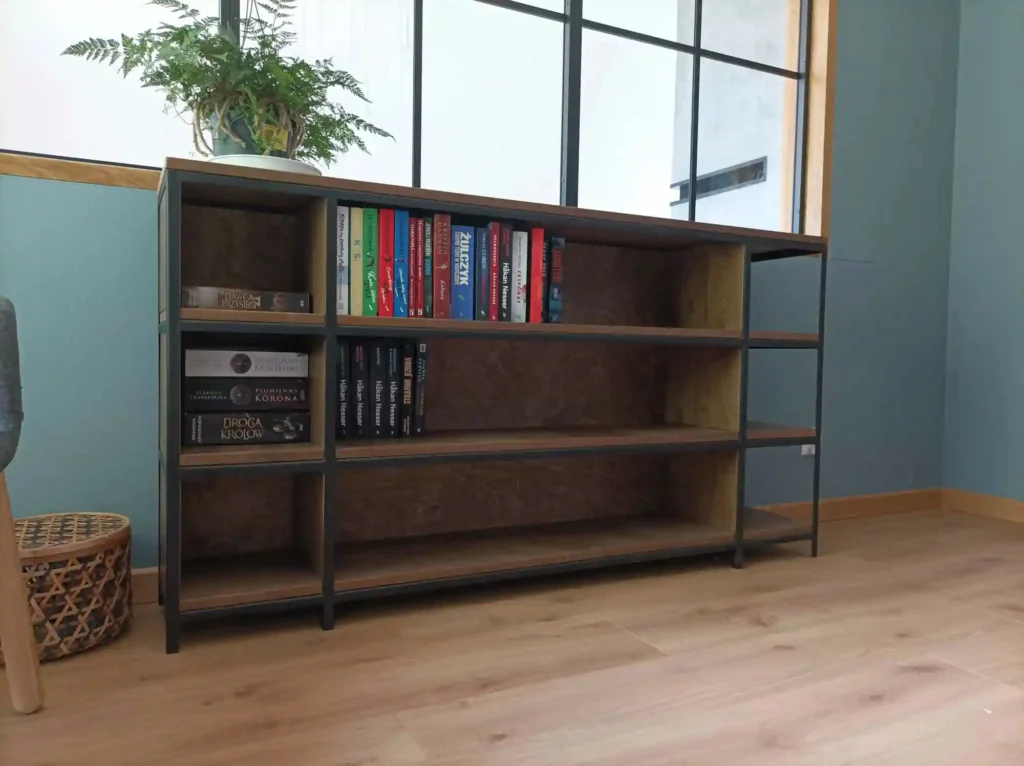 - Praktyczne rozwiązania: Meble w stylu industrialnym często mają prostą, funkcjonalną formę, co sprawia, że są bardzo praktyczne. Biurka z dużymi, solidnymi blatami, regały z otwartymi półkami czy szafki na dokumenty oferują dużo miejsca do pracy i przechowywania, jednocześnie nie zajmując nadmiernie przestrzeni.