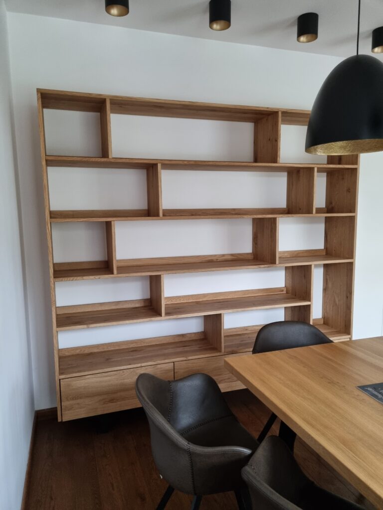 - Skala i proporcje: Upewnij się, że regał jest odpowiedniej skali i proporcjach do pomieszczenia. Zbyt duży lub zbyt mały regał może zaburzyć balans wnętrza. Dostosujemy nowoczesne regały drewniane oraz pozostałe meble z naszej oferty do wymiarów podanych przez Ciebie.