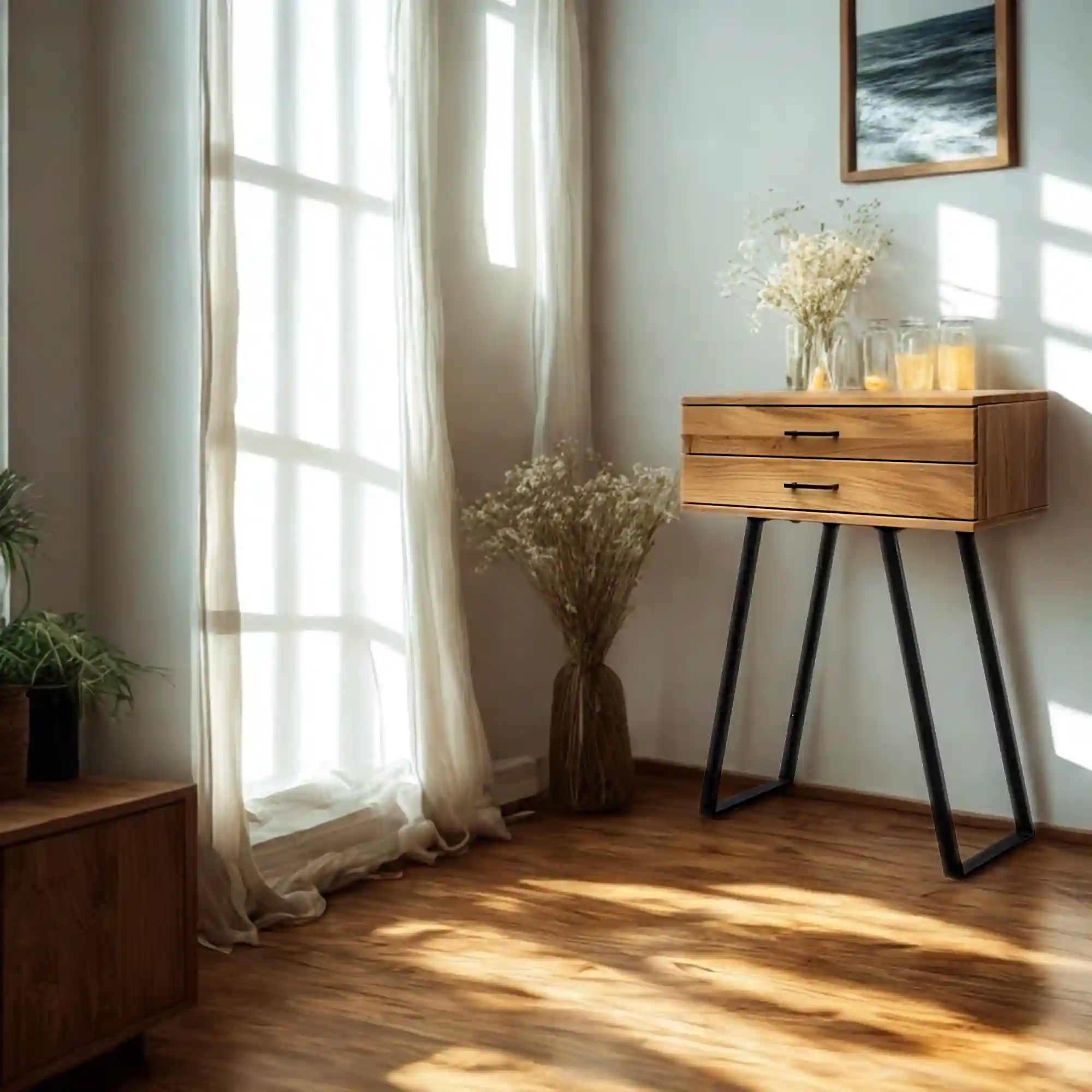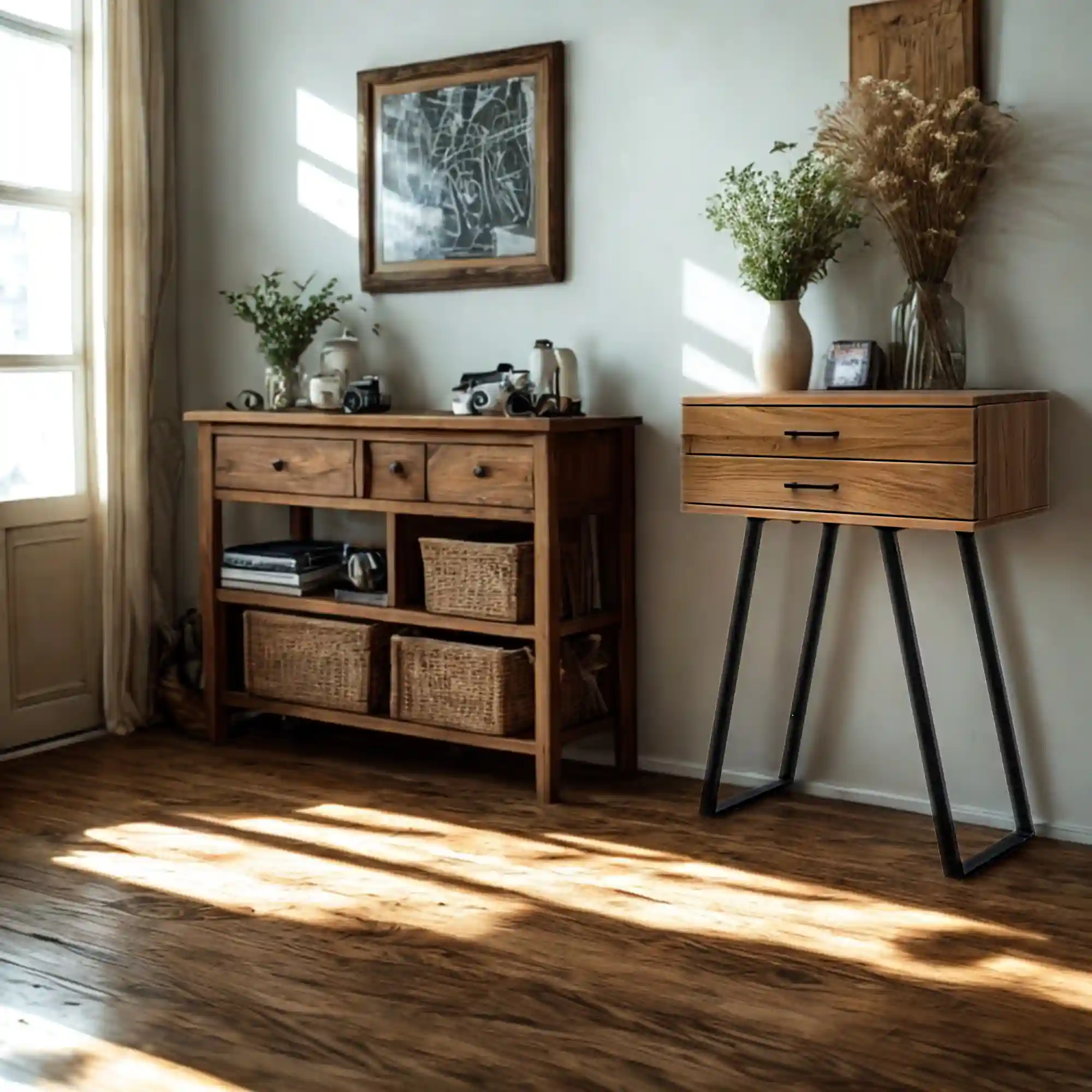 Konsole loftowe to wyjątkowe meble do Twojego wnętrza, które łączą surowość przemysłowego designu z ciepłem naturalnego drewna. Styl industrialny charakteryzuje się wykorzystaniem prostych, funkcjonalnych form oraz surowych materiałów takich jak metal i drewno. Tego typu konsole często mają stalowe ramy, jak np. nasza KONSOLA loftowa, czy MERIS, które mogą być malowane proszkowo na czarno lub pozostawione w naturalnym kolorze metalu. Drewno zazwyczaj ma wyraźne słoje, co dodaje mu charakteru i unikalnego wyglądu. Konsole drewniane w stylu industrialnym są nie tylko estetyczne, ale również bardzo praktyczne. Mogą być zaprojektowane z dodatkowymi szufladami, półkami lub otwartymi przestrzeniami do przechowywania. To sprawia, że doskonale sprawdzają się zarówno w salonie, jak i w przedpokoju, czy sypialni. Ich uniwersalny design pozwala na łatwe wkomponowanie w różnorodne aranżacje wnętrz, dodając im wyjątkowego charakteru. Styl industrialny, dzięki swojej surowości i prostocie, idealnie współgra z innymi stylami, takimi jak nowoczesny, skandynawski, tworząc harmonijne przestrzenie.