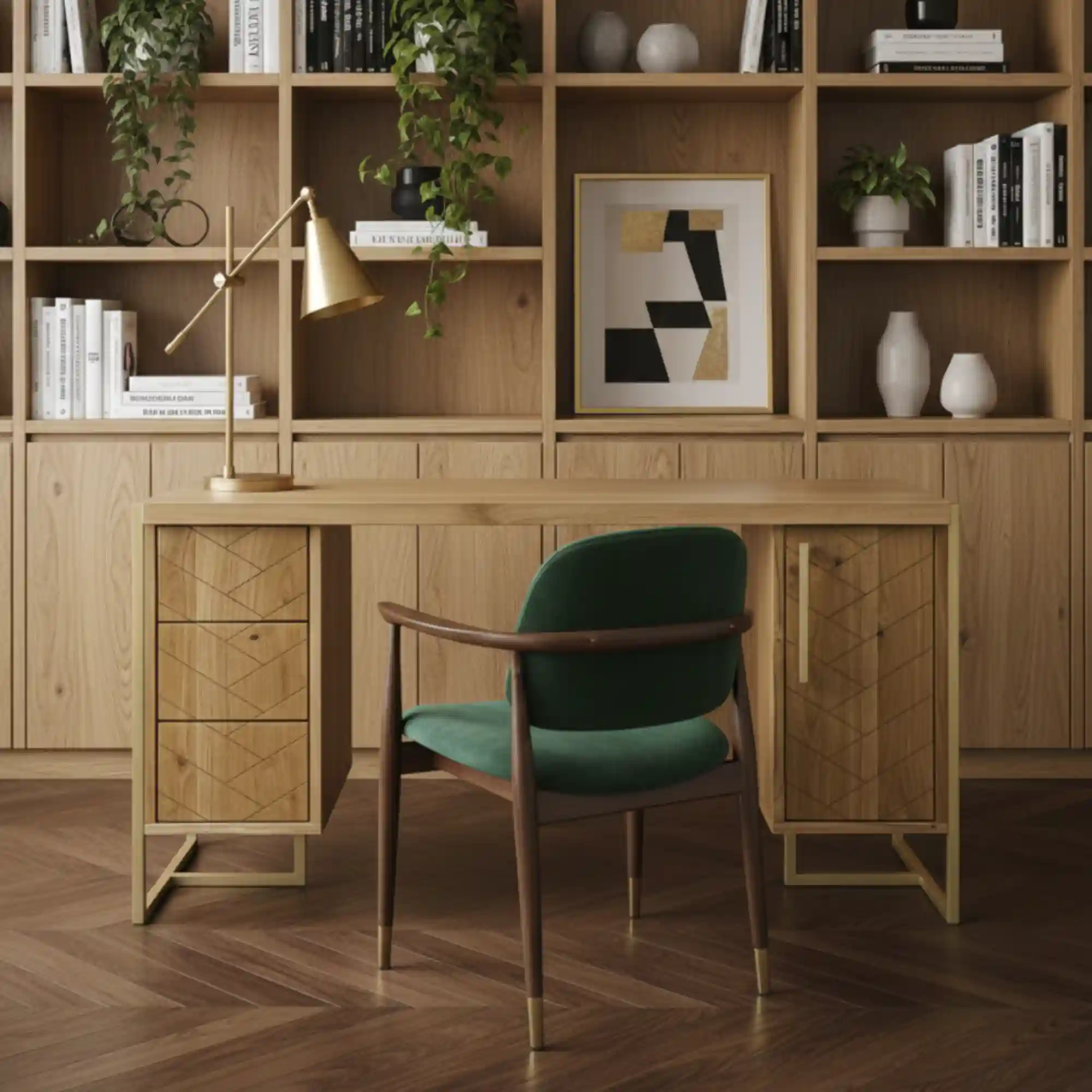 Biurko designerskie CARIN II wykonane z połączenia litego drewna dębowego i stali wyróżnia się nowoczesnym designem i perfekcyjnym wykonaniem. Stylowe biurko dębowe na zamówienie CARIN I wykonano z solidnego litego drewna dębowego w kolorze naturalnym. Natomiast nogi i uchwyt wykonano ze stali malowanej proszkowo na kolor złoty. Ciepła kolorystyka naturalnego drewna dębowego doskonale komponuje się ze złotymi stalowymi elementami. Drewniane biurko posiada dwa kontenerki, dzięki czemu zapewnia funkcjonalność oraz dużo miejsca do przechowywania. Kontenerek po lewej stronie wyposażono w trzy pojemne szuflady, otwierane dotykowo. Natomiast kontenerek z prawej strony posiada w środku półkę, dzięki czemu jest bardziej praktyczny i funkcjonalny. Biurka z drewna litego to gwarancja solidności, trwałości i najwyższej jakości. Wszystkie nasze biurka dębowe wykonane są ręcznie z litego drewna dębowego, z dbałością o każdy detal. Biurko dębowe posiada oryginalne fronty ze wzorem w jodełkę sprawiają, że mebel wygląda oryginalnie i dodaje wnętrzom szlachetnego wyglądu. Nowoczesne biurko dębowe do gabinetu CARIN I to niezwykle unikatowa i funkcjonalna propozycja do kancelarii, domowego biura, jak i domowego gabinetu.