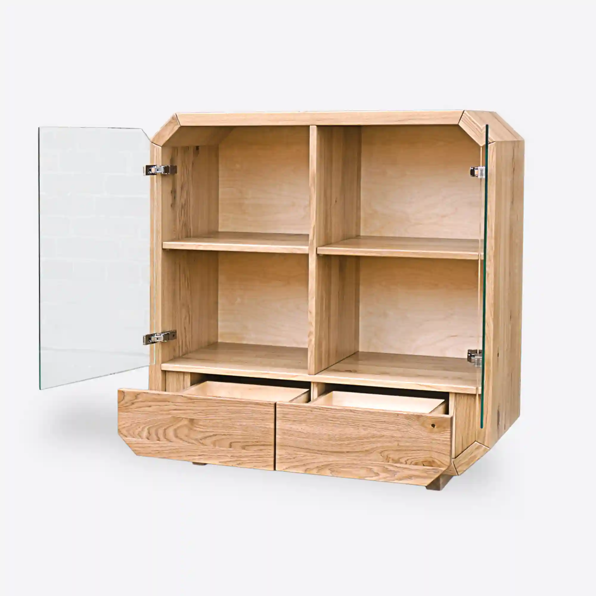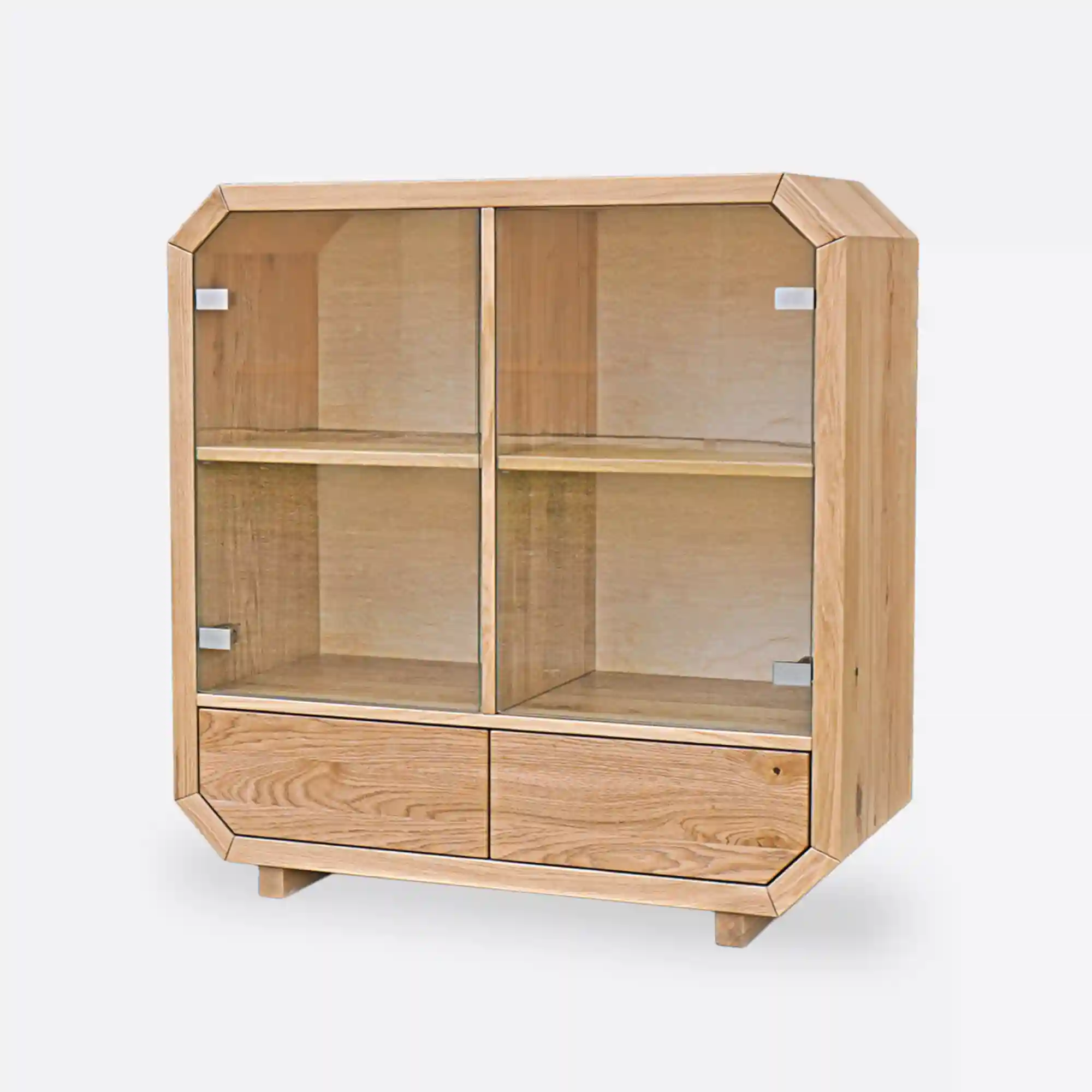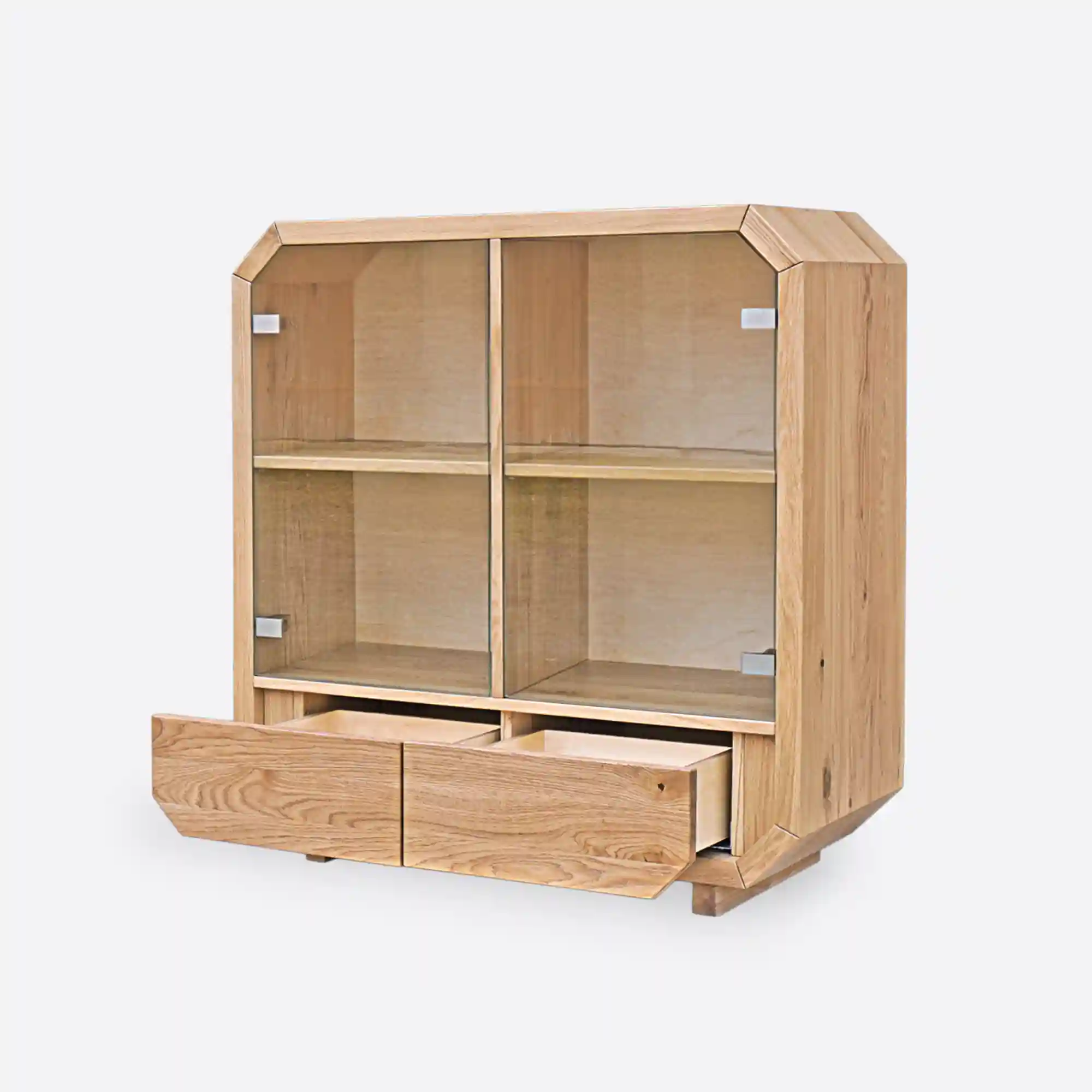 Designerska komoda drewniana OMNIS wykonana ręcznie z najwyższej jakości drewna. Rama mebla kształtem odwzorowuje oktagon, do niej zatem dostosowano fronty drzwiczek szklanych, jak i szuflady z drewna dębowego. Nowoczesna komoda posiada cztery szafki oraz dwie szuflady, które są bardzo pojemne i pozwolą na lepszą organizację w salonie, sypialni. Solidna komoda z drewna litego OMNIS wprowadza do wnętrza ciepły i przytulny klimat. Natomiast szklane drzwiczki szafek nadają całości lekkiego charakteru. Fronty z drewna dębowego bez uchwytów sprawiają, że designerska drewniana komoda nabiera klasy, trwałości i oryginalności. Designerska komoda dębowa ze szklanymi frontami OMNIS to oryginalny i funkcjonalny, a zarazem elegancji mebel, który świetnie wpisuje się w nowoczesne wnętrza.