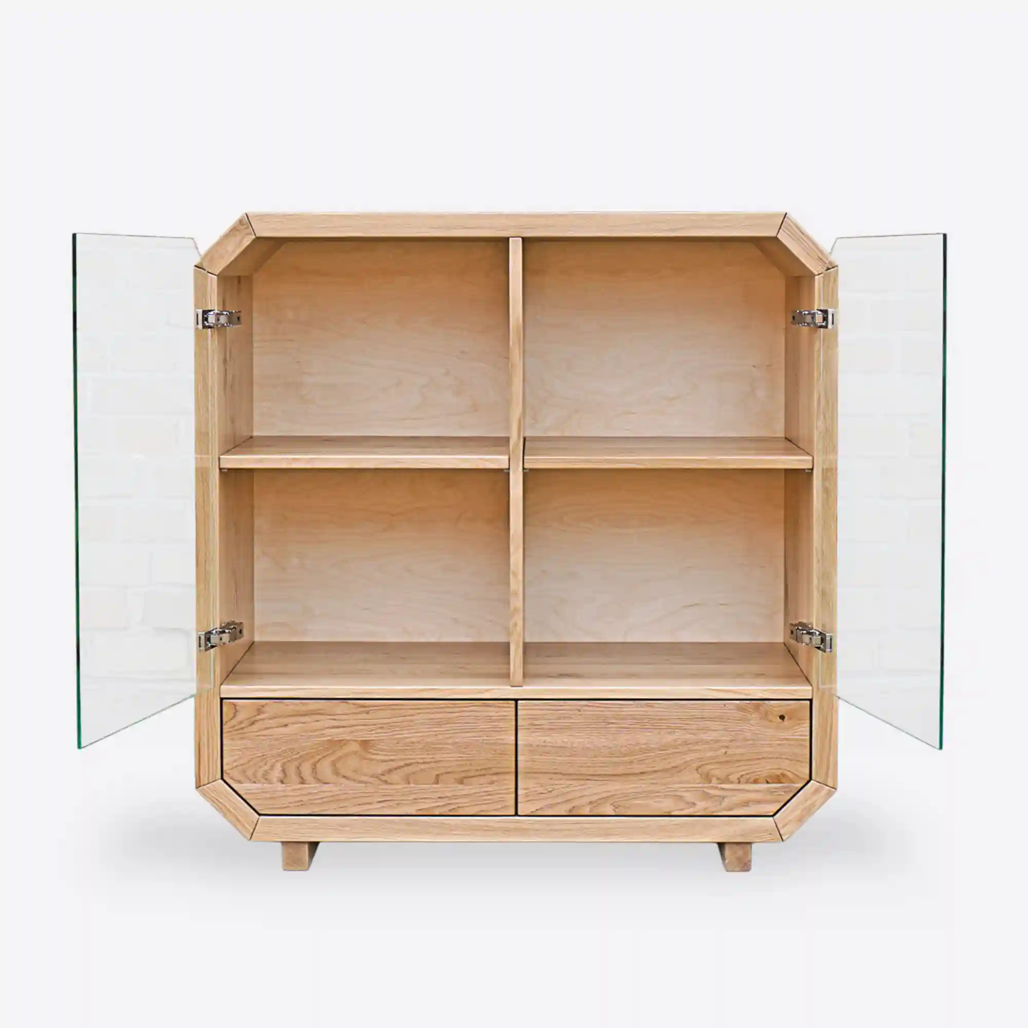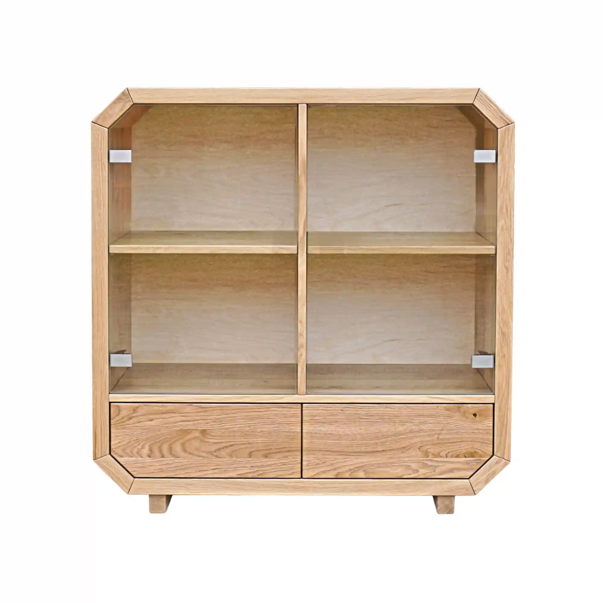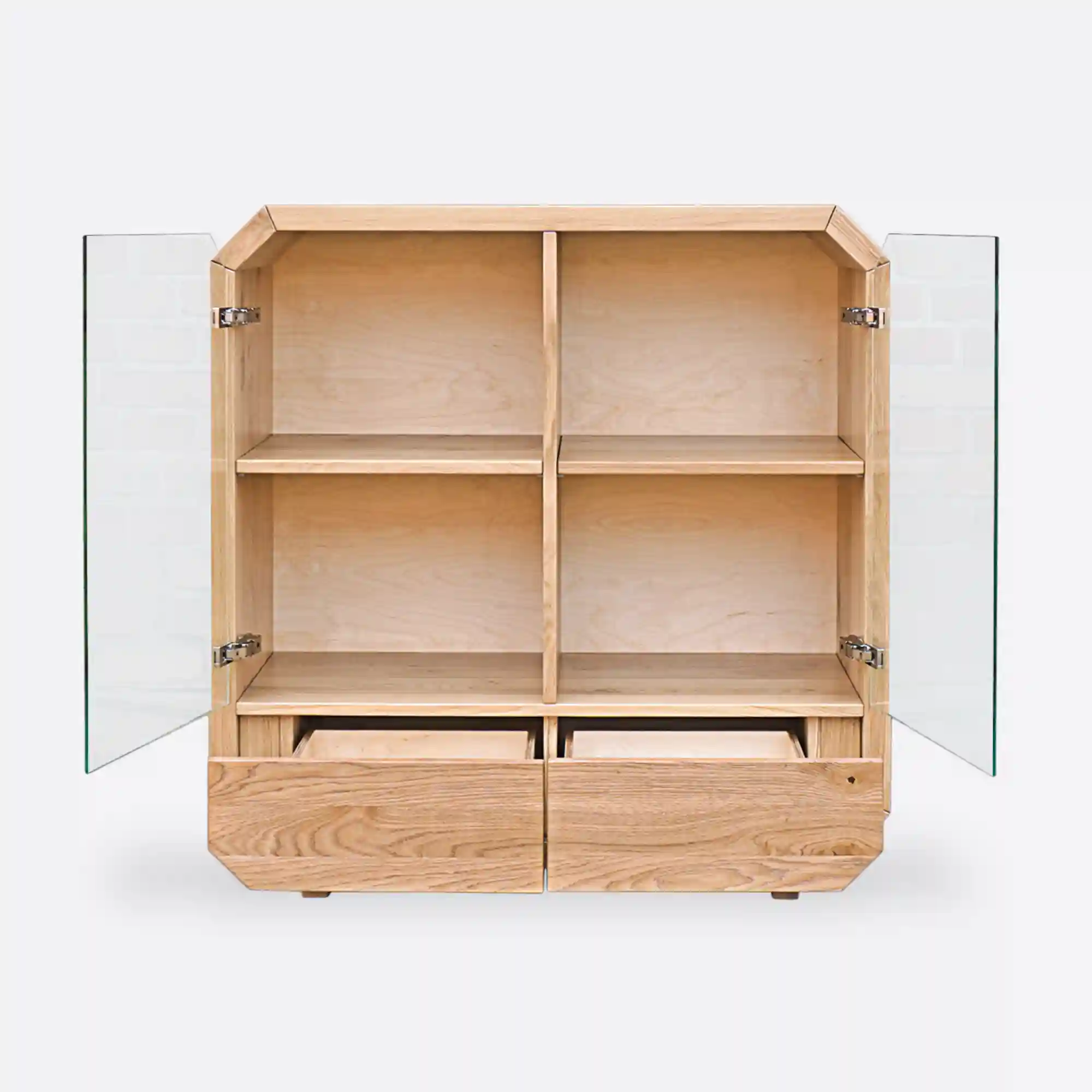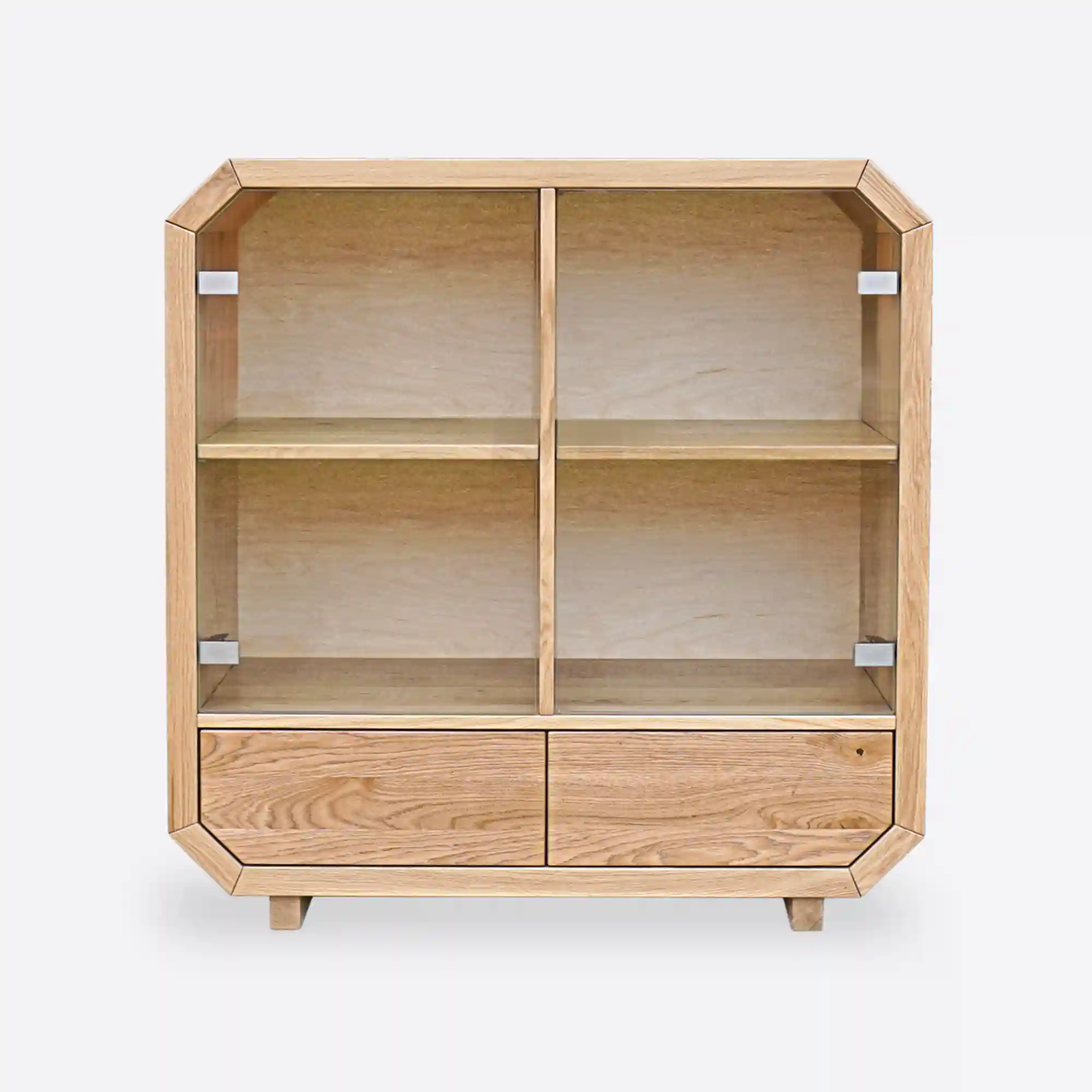 Designerska komoda drewniana OMNIS wykonana ręcznie z najwyższej jakości drewna. Rama mebla kształtem odwzorowuje oktagon, do niej zatem dostosowano fronty drzwiczek szklanych, jak i szuflady z drewna dębowego. Nowoczesna komoda posiada cztery szafki oraz dwie szuflady, które są bardzo pojemne i pozwolą na lepszą organizację w salonie, sypialni. Solidna komoda z drewna litego OMNIS wprowadza do wnętrza ciepły i przytulny klimat. Natomiast szklane drzwiczki szafek nadają całości lekkiego charakteru. Fronty z drewna dębowego bez uchwytów sprawiają, że designerska drewniana komoda nabiera klasy, trwałości i oryginalności. Designerska komoda dębowa ze szklanymi frontami OMNIS to oryginalny i funkcjonalny, a zarazem elegancji mebel, który świetnie wpisuje się w nowoczesne wnętrza.