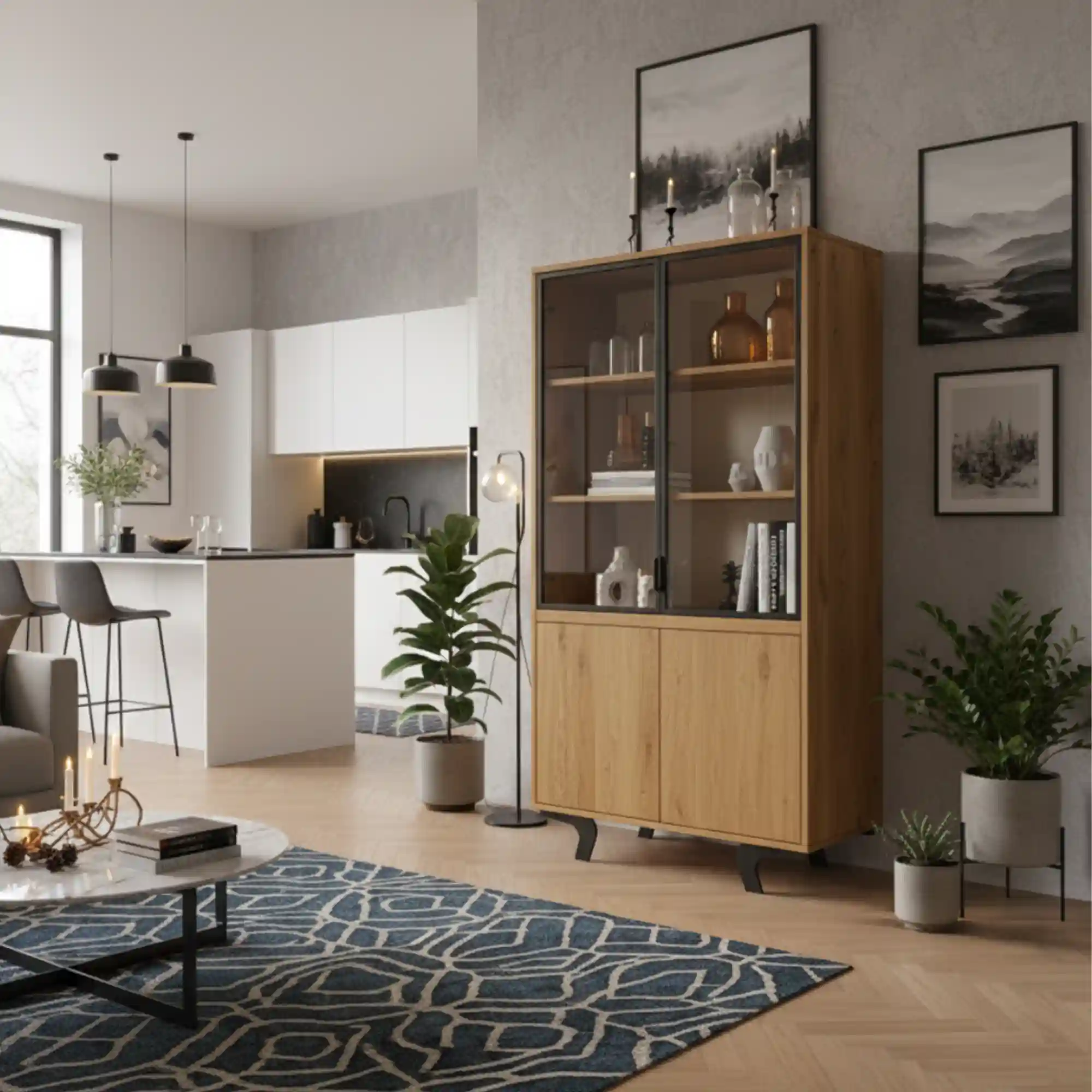 witryny o lekkiej konstrukcji, jasnym wykończeniu i funkcjonalnym designie. Proste formy, minimalna ilość zdobień, maksimum funkcjonalności. Przeszklenie przezroczyste z cienką ramą, półki szklane lub z jasnego drewna, oświetlenie LED dyskretnie ukryte. Witryny skandynawskie często mają mniejsze wymiary (80-120 cm szerokości) i lekkie nogi lub cokół, co tworzy wrażenie przestronności i lekkości.