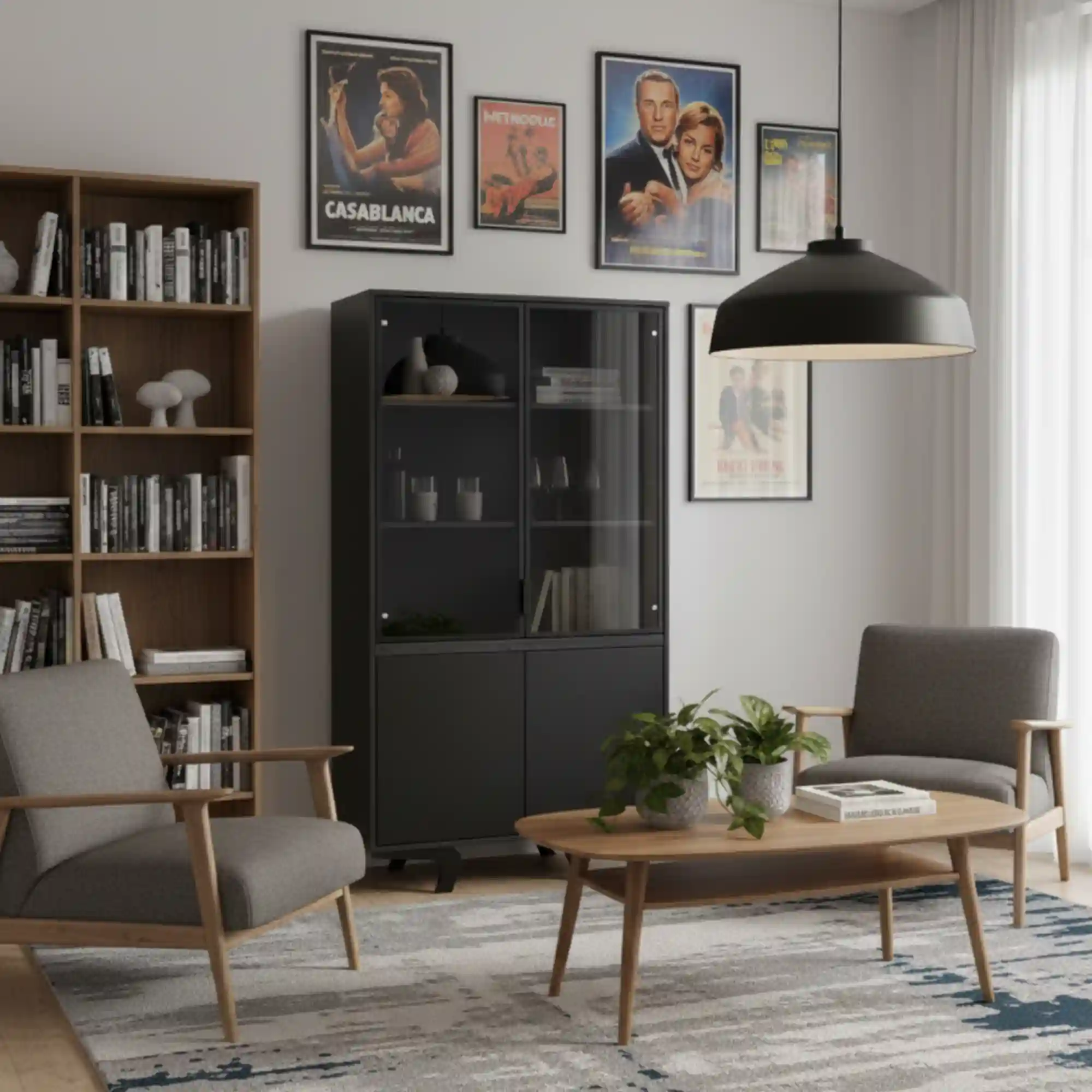 witryny o czystej linii, z cienką ramą drewnianą lub metalową (czarna stal), maksymalnym przeszkleniem (minimalna ilość drewna, maksimum przezroczystości), półkami szklanymi i subtelnym oświetleniem LED. Preferowane są proste formy geometryczne, symetryczny układ, brak ornamentów i zdobień. Przeszklenie przezroczyste float, oświetlenie neutralne lub zimne, wykończenie drewna jasne (lakier naturalny, olej bezbarwny).Dla miłośników
