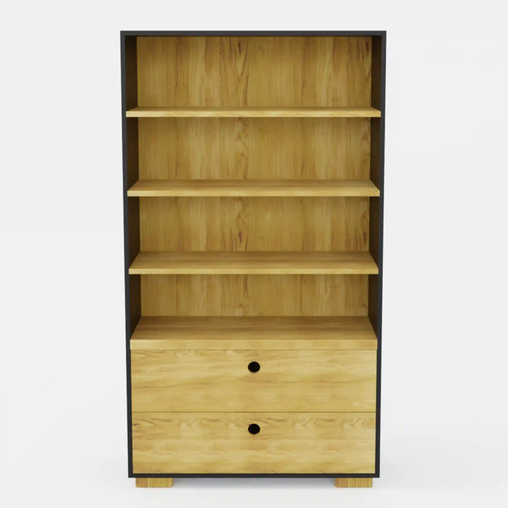 Duży regał na książki drewniany z szufladami i półkami CARLA to uniwersalna i niepowtarzalna propozycja mebla o niezwykle szerokich możliwościach aranżacyjnych. Solidny regał wykonano z dębowego drewna litego oraz płyty laminowanej w kolorze czarnym. Designerski regał posiada trzy dębowe półki oraz dwie szuflady, dzięki czemu zapewni dużo miejsca do przechowywania. Nowoczesny drewniany regał dzięki swej prostej i funkcjonalnej formie będzie pasował zarówno do salonu, jadalni jak również gabinetu czy biura. Regał z szufladami i półkami, estetycznie wykonany z dbałością o detale to połączenie oryginalności i ponadczasowego designu. Sprawdzi się doskonale jako praktyczny dodatek do wnętrza. Duży regał na książki drewniany dzięki swojej prostej formie doda charakteru każdemu wnętrzu salonu, jadalni czy gabinetu.