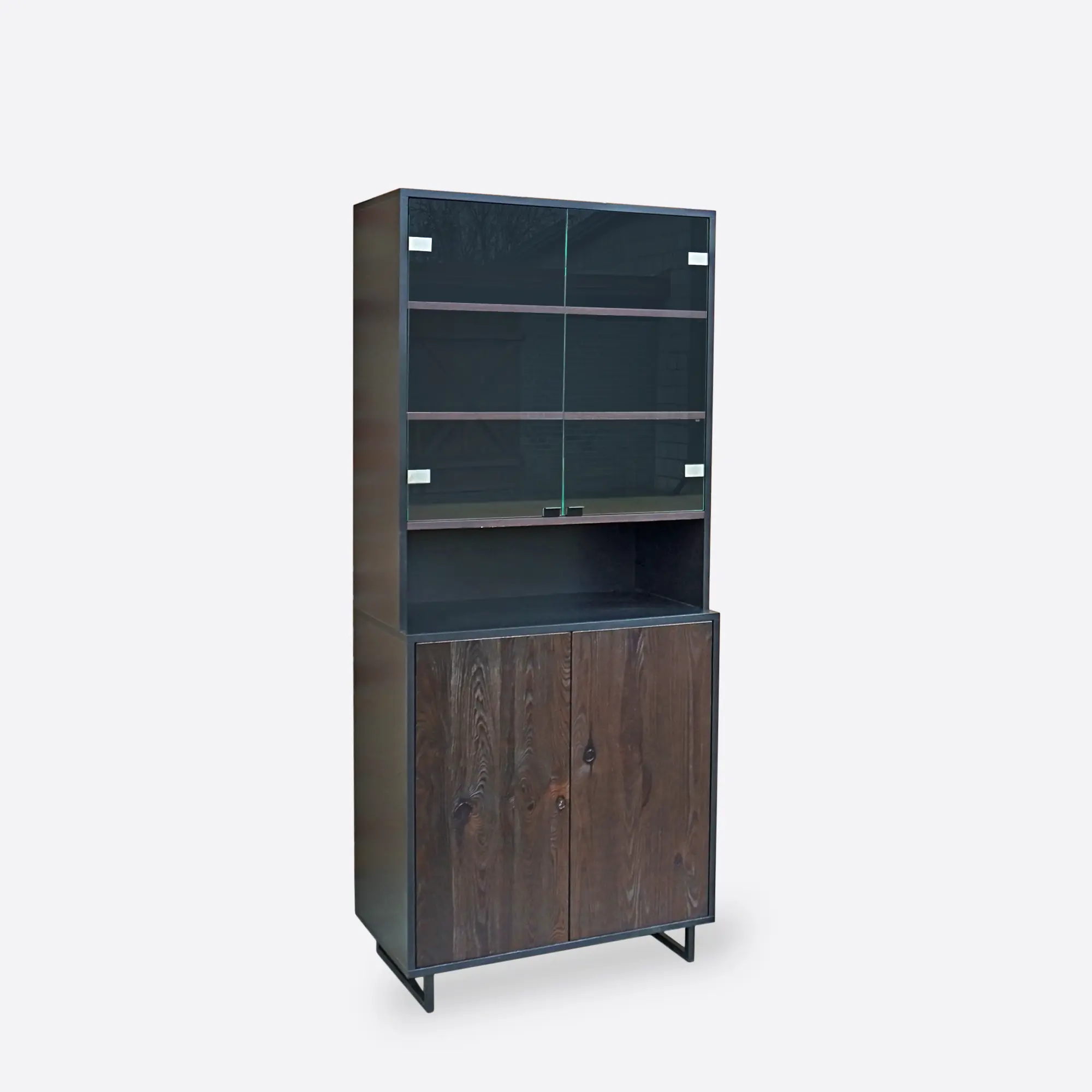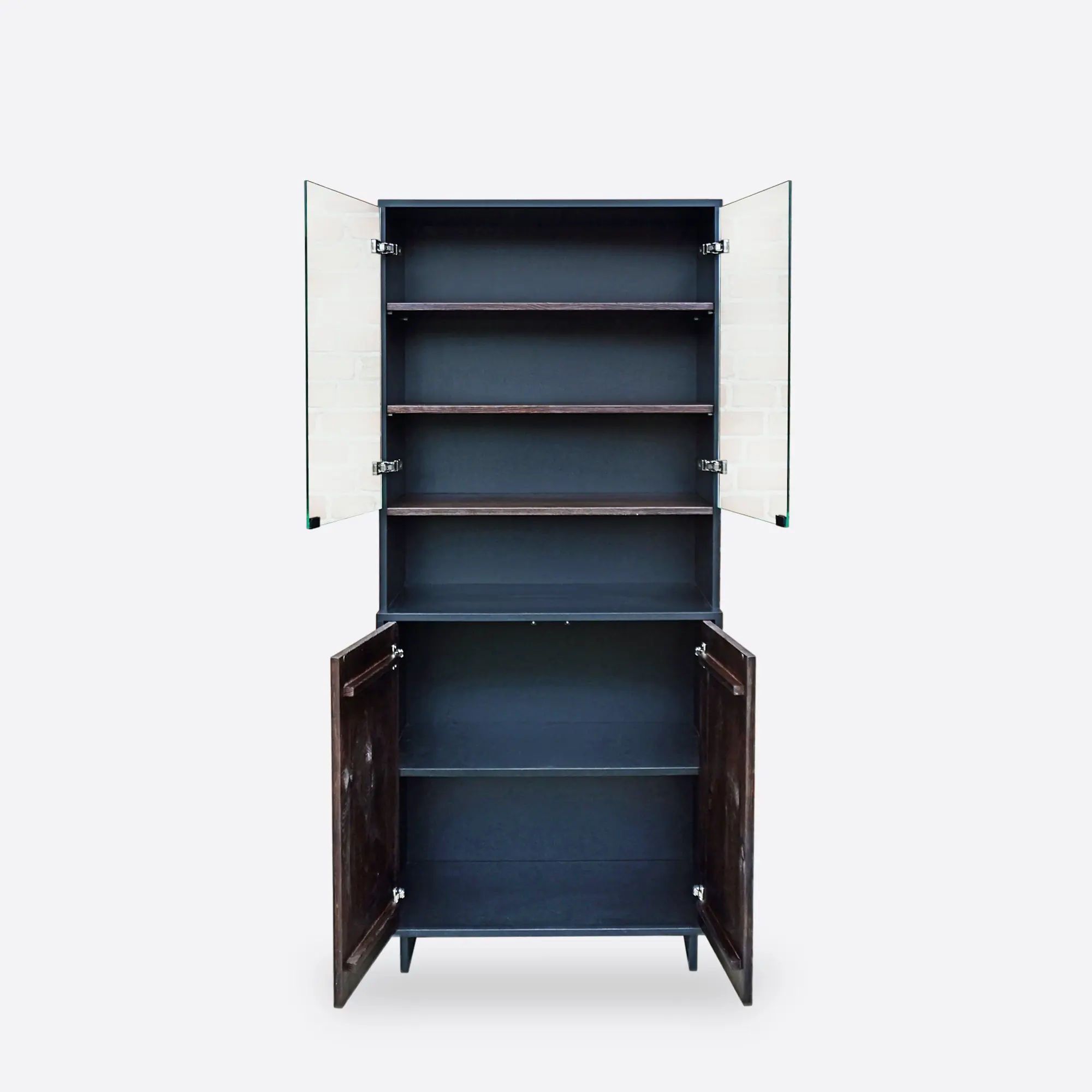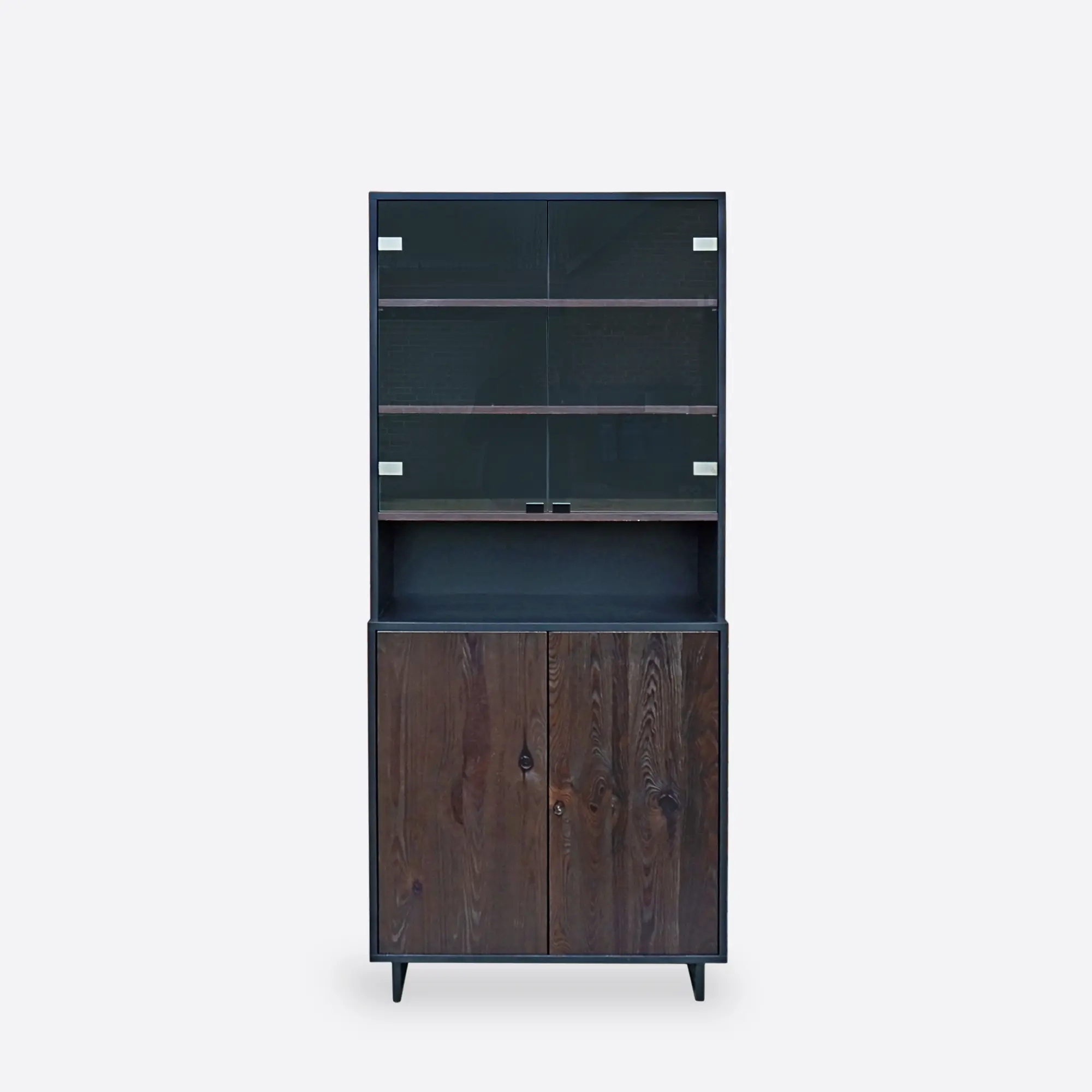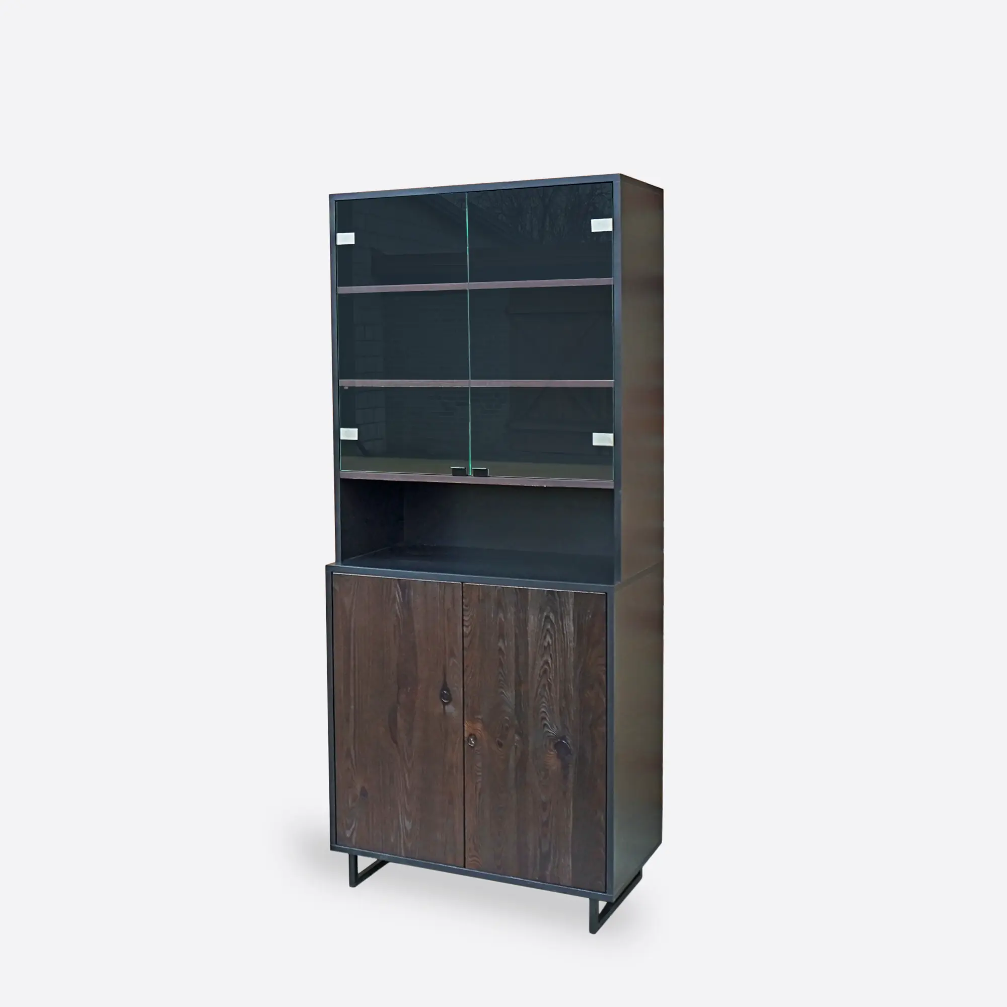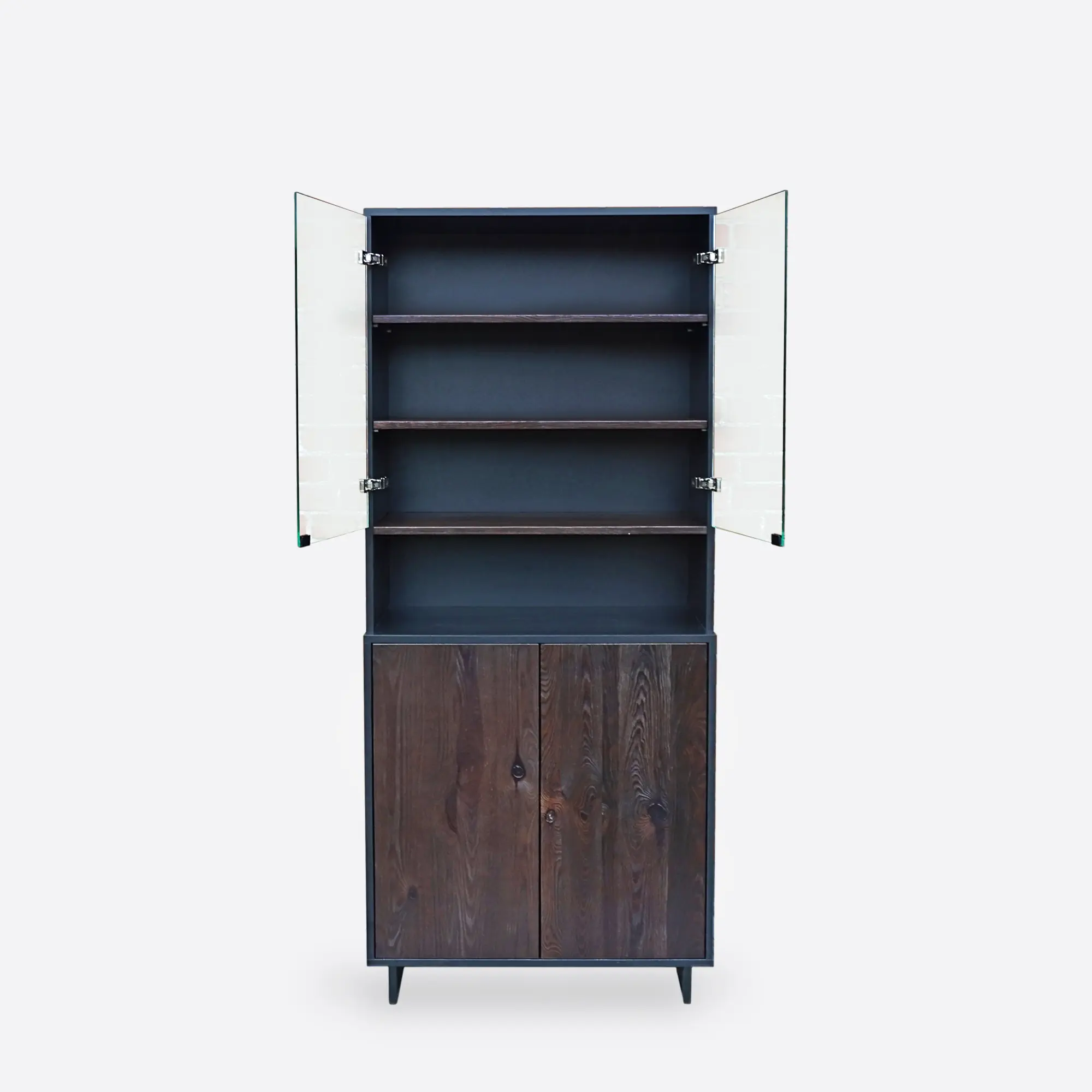 Elegancka witryna kredens z drewna litego ze szkłem NESCA II jest doskonałym połączeniem nowoczesnej formy z oryginalnym i niepowtarzalnym wyglądem. Korpus witryny drewniane j wykonano z czarnej płyty laminowanej. Natomiast fronty witryny oraz półki wykonano z solidnego starego drewna. Nowoczesna witryna drewniana posiada trzy półki ukryte za szkłem oraz dwie półki za drewnianymi drzwiczkami. Za szklanymi frontami możesz postawić dekoracje czy pamiątki rodzinne. Witryna drewniana to mebel nie tylko do przechowywania, ale przede wszystkim do dekoracji wnętrza. Dodatkowo w środkowej części witryna drewniana posiada otwartą półkę na drobne rzeczy które chcemy mieć pod ręką. Nogi mebla wykonano ze stali w kolorze czarnym, które są niezwykle stabilne i trwałe. Elegancka witryna kredens z drewna litego ze szkłem NESCA II to oryginalne i nowoczesne połączenie materiałów, które zapewni znakomitą wytrzymałość oraz niepowtarzalny wygląd.
