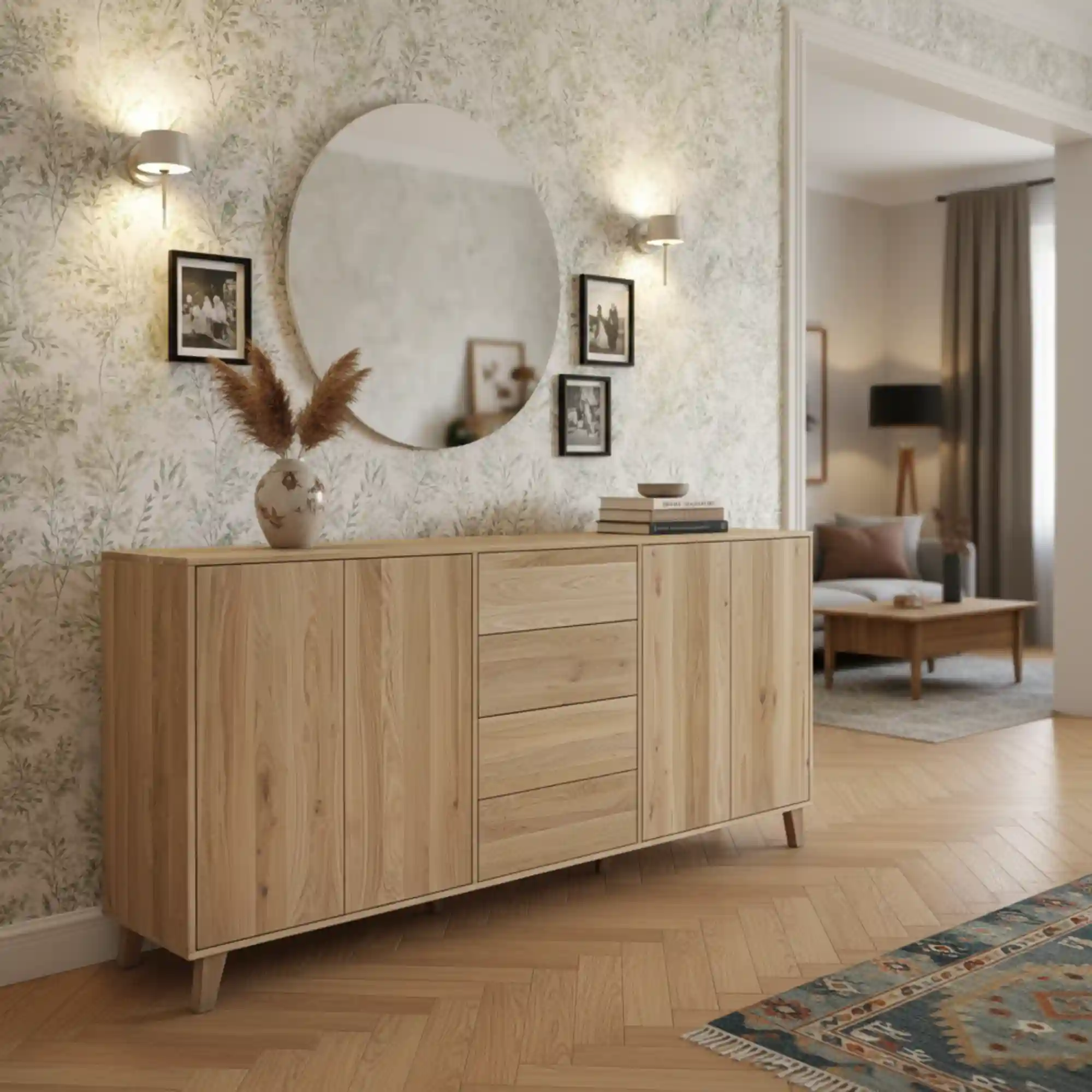 Komoda dębowa na nóżkach NESS II to doskonały wybór do każdego wnętrza, niezależnie od tego, czy będzie pełnić funkcję w salonie, sypialni, gabinecie czy przedpokoju. Wykonana z litego drewna dębowego, zachwyca naturalnym pięknem i solidnością. Dbałość o szczegóły sprawia, że jest nie tylko meblem użytkowym, ale także dekoracyjnym. Komoda dębowa na nóżkach NESS II oferuje 4 pojemne szuflady oraz 2 szafki z półkami w środku. Dzięki temu zapewnia wiele miejsca na przechowywanie ubrań, pościeli, ręczników czy zabawek. Funkcjonalność mebla podkreśla cichy system domykania szuflad, co podnosi komfort użytkowania. Osadzona na eleganckich, dębowych nóżkach, komoda prezentuje się lekko, jednocześnie podkreślając naturalny charakter materiału. Dzięki swojemu minimalistycznemu designowi i wysokiej jakości wykonania, komoda dębowa NESS II idealnie wpisuje się w nowoczesne wnętrza, pasując do stylów takich jak skandynawski, industrialny czy klasyczny. To mebel, który łączy funkcjonalność z wyjątkową estetyką, stając się centralnym punktem każdego pomieszczenia.