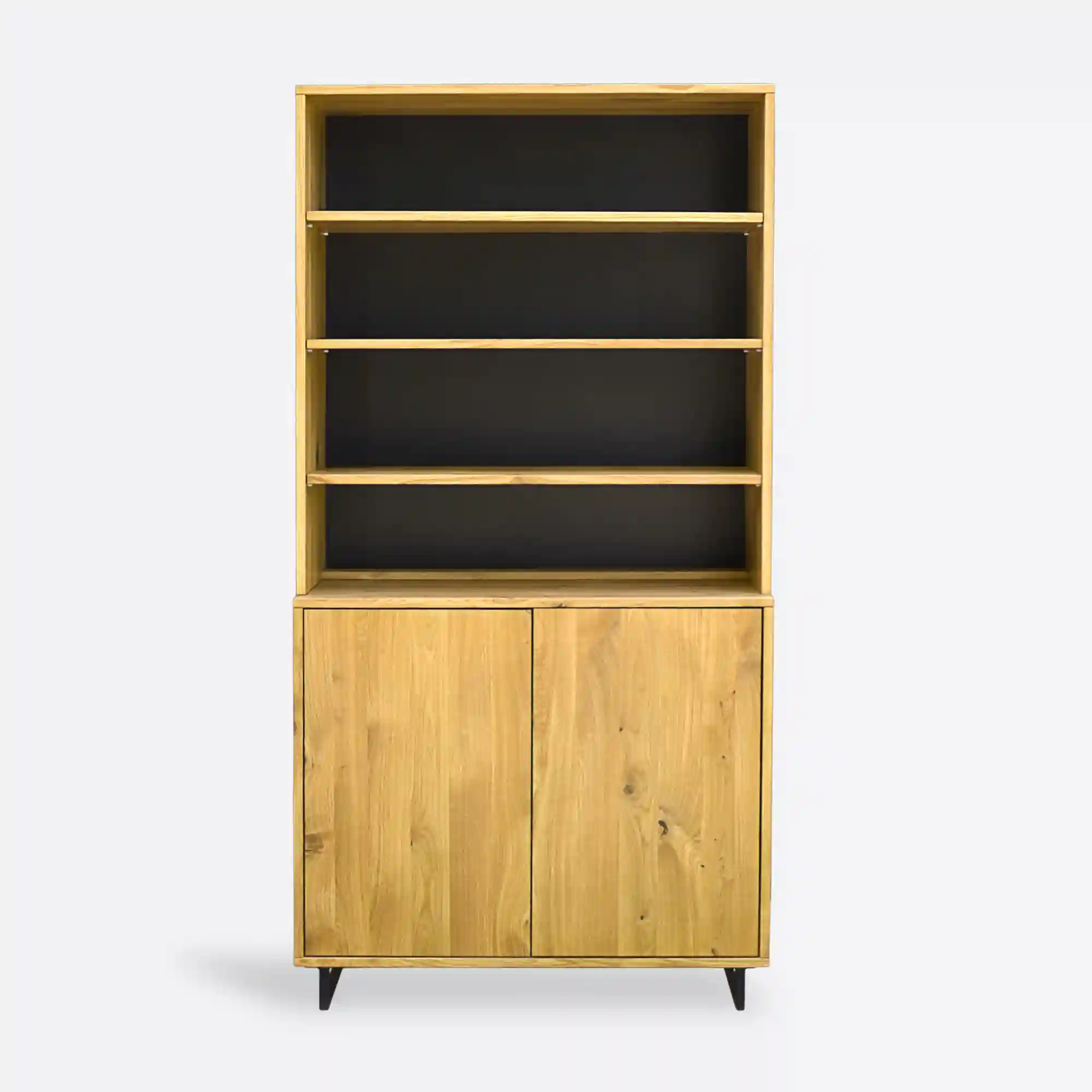 Nowoczesna witryna, kredens z drewna litego do salonu NESCA II jest doskonałym przykładem prostej nowoczesnej formy połączonej z trwałością. Witrynę wykonano z dębowego drewna litego. Natomiast plecy są z czarnej płyty, aby podkreślić kontrast i charakter mebla. Oryginalna dębowa witryna jest bardzo pojemna, gdyż posiada 3 otwarte półki oraz dużą zamkniętą przestrzeń z dwiema półkami. Nogi kredensu wykonano ze stali w kolorze czarnym, które nadają meblu lekkości, jak również stabilności. Nowoczesna witryna z drewna litego do salonu NESCA II to oryginalne i nowoczesne połączenie materiałów, które zapewni znakomitą wytrzymałość i stabilność oraz niepowtarzalny wygląd.