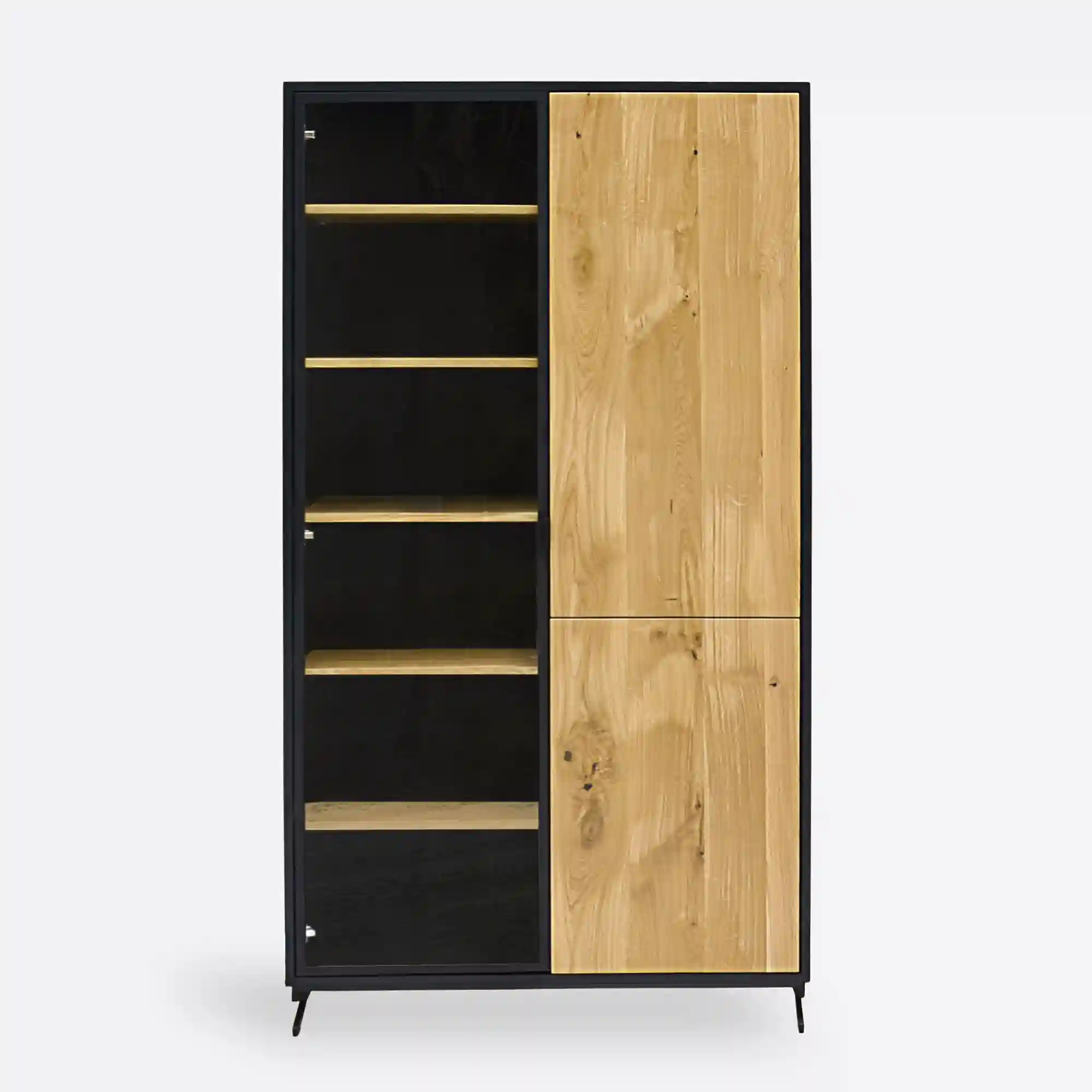 Doskonałe połączenie nowoczesności z tradycją. Ciekawa forma łączy się bowiem z solidnymi materiałami. Sprawdzi się on doskonale jako designerskie uzupełnienie nowoczesnych aranżacji. Wszystko za sprawą ciekawej formy oraz oryginalnego wyglądu. Designerski regał wykonano z solidnego dębowego drewna litego oraz płyty laminowanej. Ponadto jedne drzwi regału wykonano ze szkła w metalowej ramce, co umożliwia wyeksponowanie ciekawych ozdób i książek. Nogi mebla wykonano ze stali malowanej proszkowo na kolor czarny. Loftowy regał dębowy jest niezwykle pojemny i funkcjonalny, dzięki temu, że posiada aż 9 półek! Z pewnością nie zabraknie w nim miejsca na żadne dokumenty czy segregatory w gabinecie. Ręcznie wykonany dębowy regał będzie doskonałą propozycją dla wszystkich, którym zależy na najwyższej jakości wykończenia. Ciekawy, minimalistyczny design sprawia, że dębowy regał na książki stanie się ozdobą niejednego współczesnego wnętrza. Naturalne drewno łączy się z płytą laminowaną, co nadaje mu niepowtarzalnego charakteru. Regał na książki dębowy CASTEL sprawdzi się doskonale w rozmaitych aranżacjach. Będzie idealną ozdobą w pomieszczeniach w stylu klasycznym, ale też industrialnym.