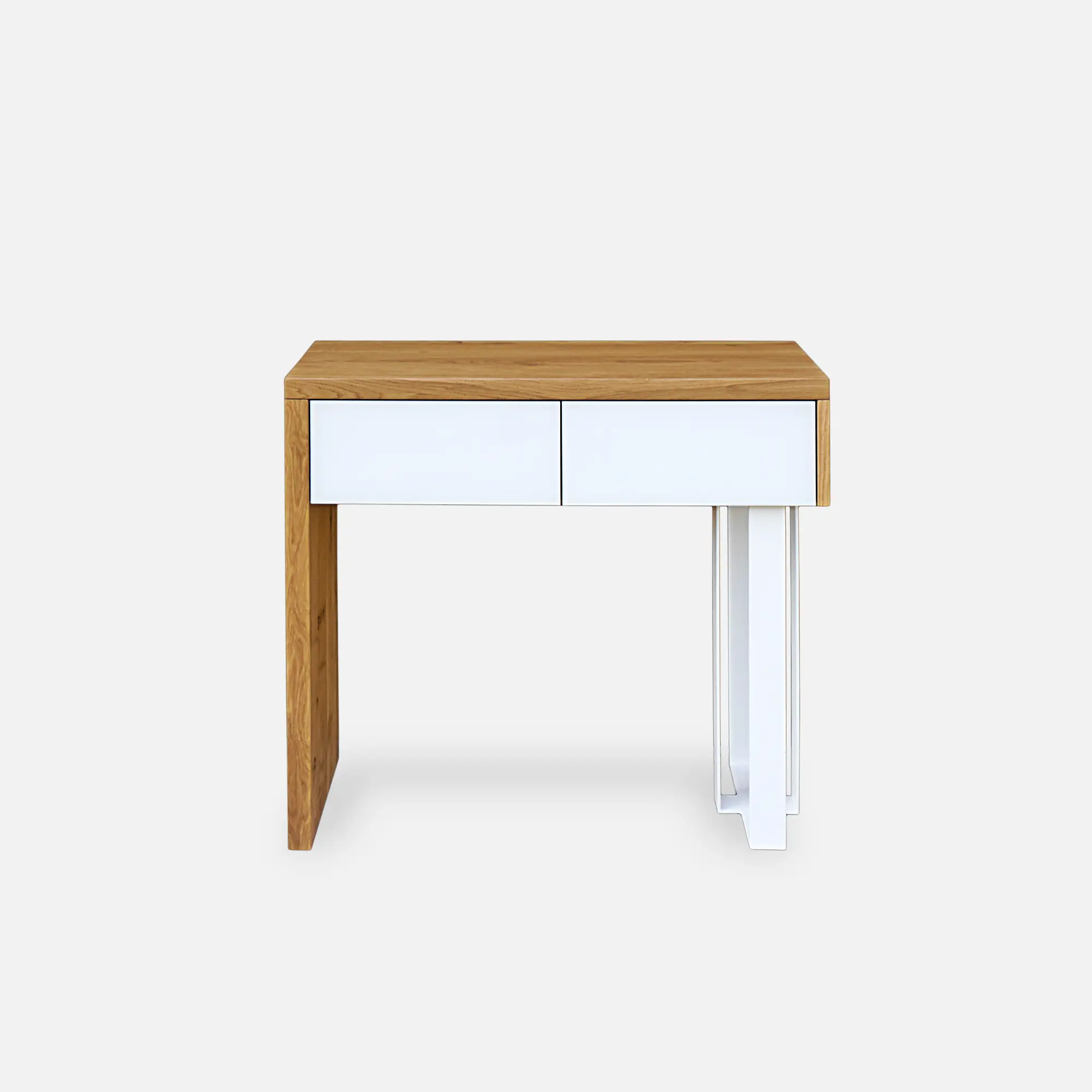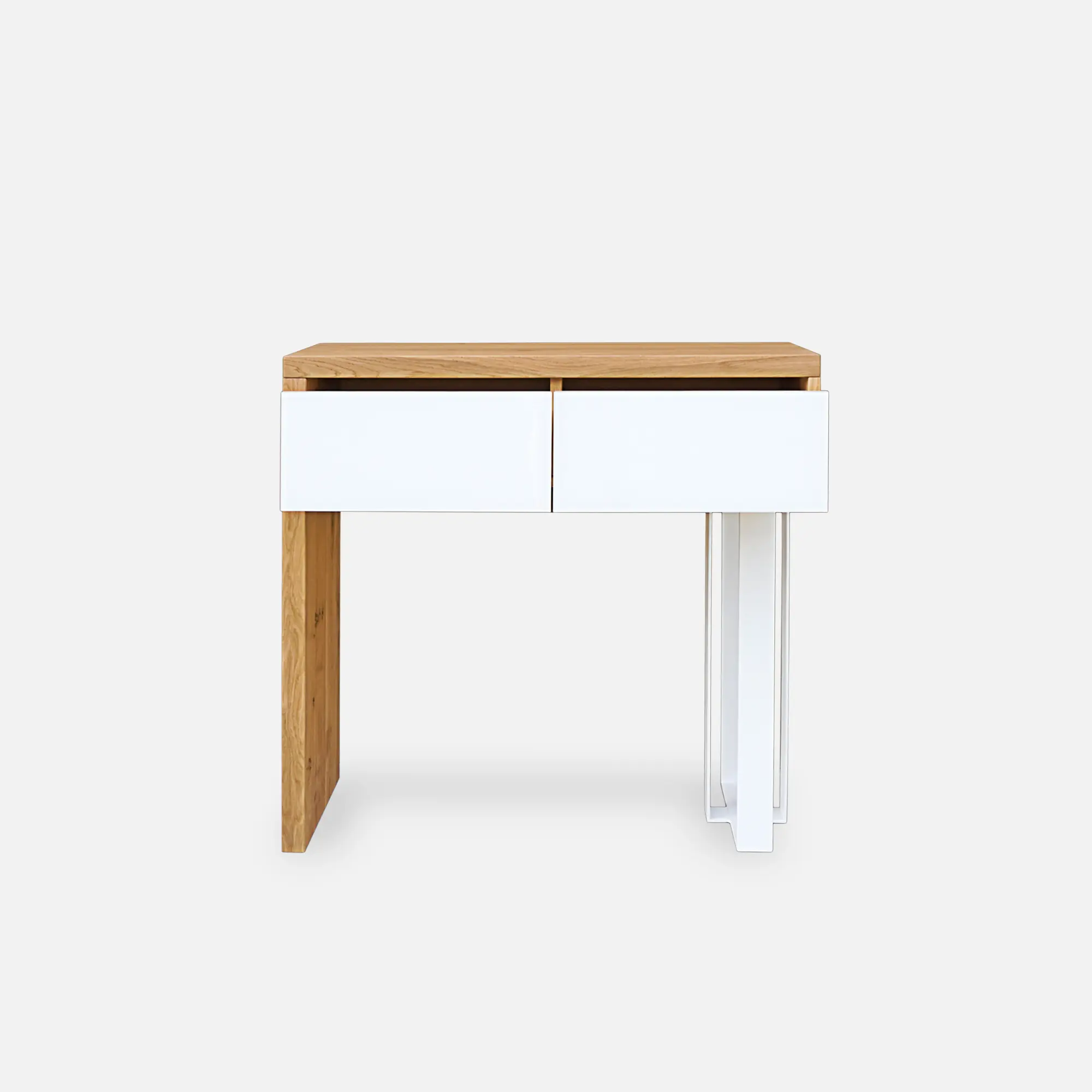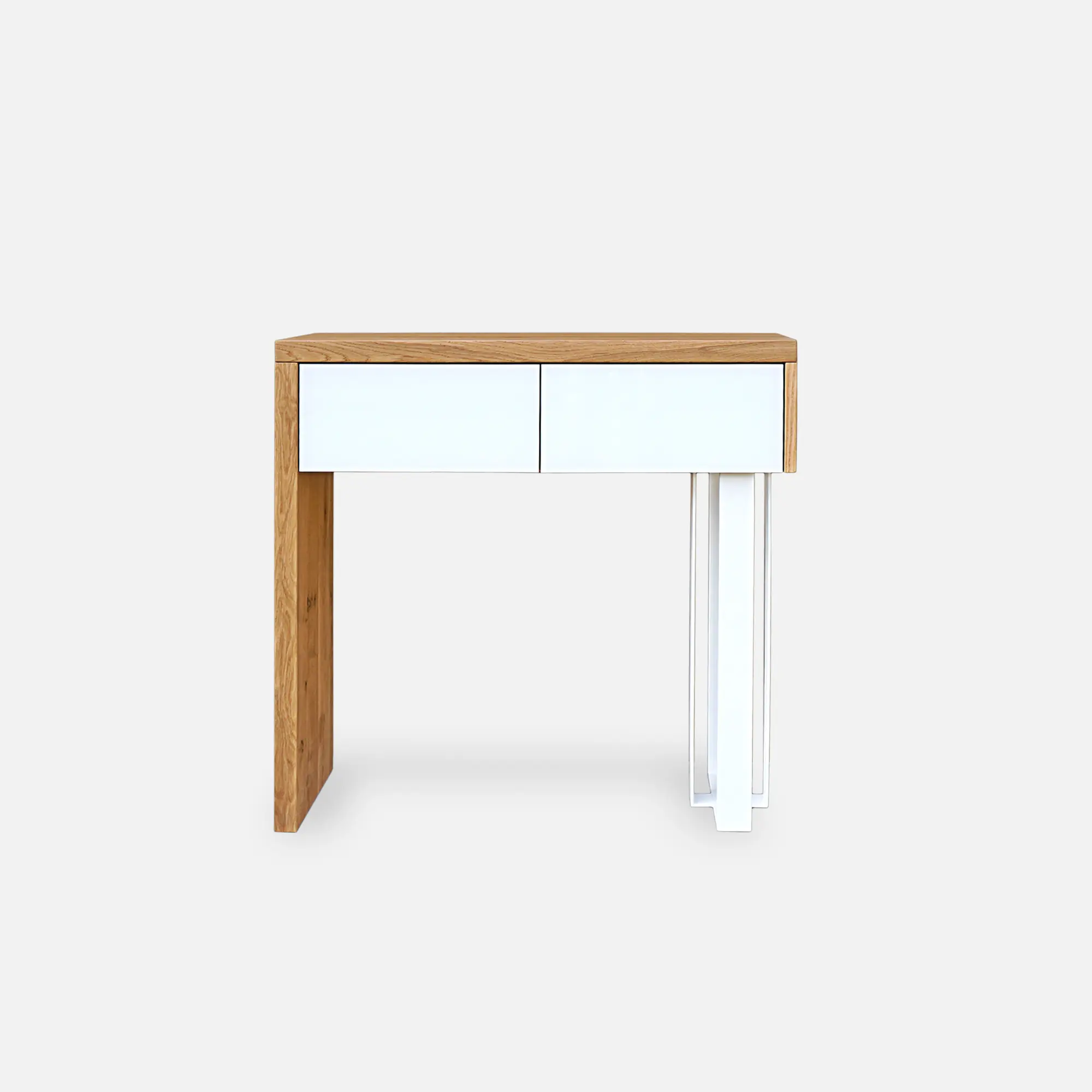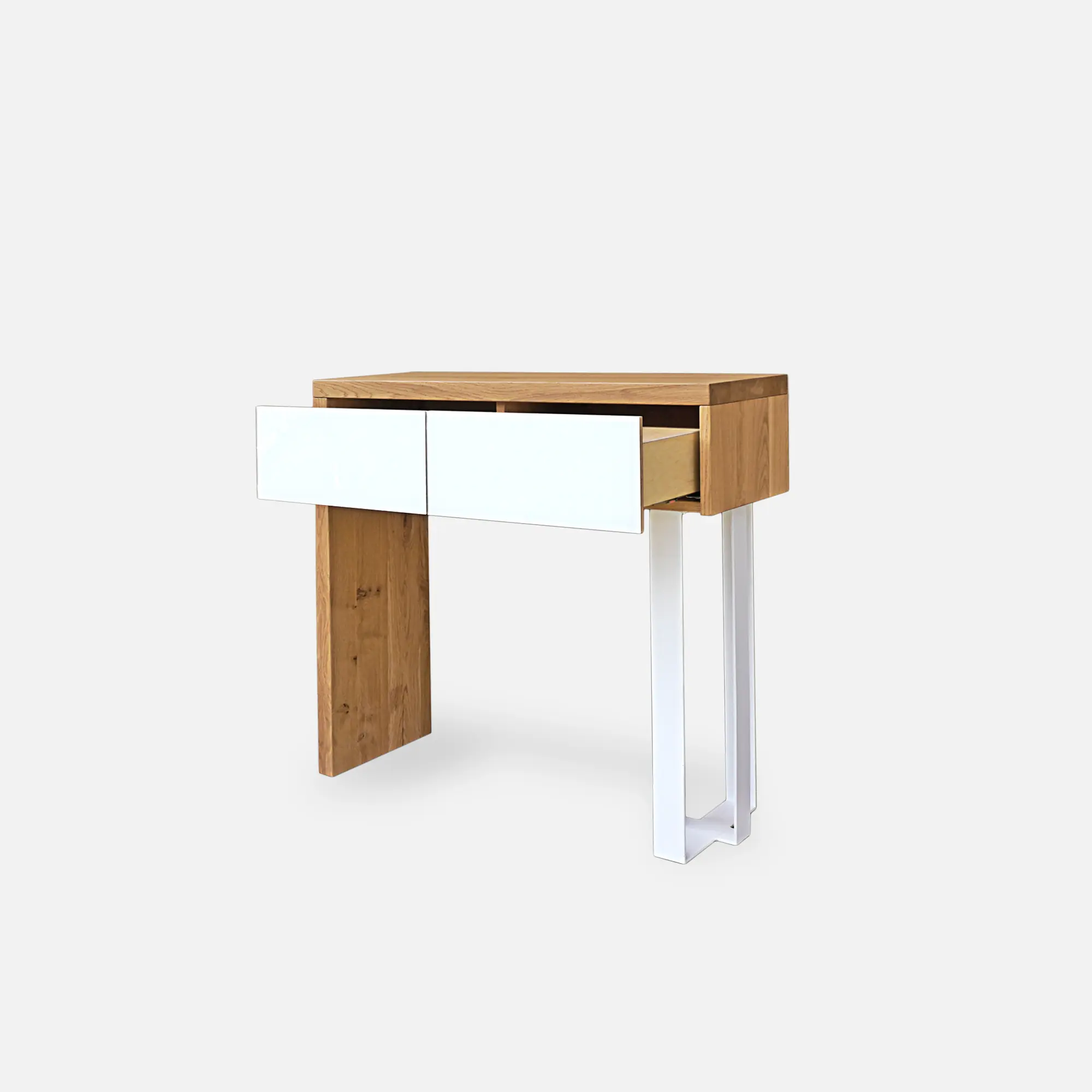 Pomocnik, konsola drewniana nowoczesna MOCCA wkomponuje idealnie w każdy przedpokój, salonu, ze względu na swój oryginalny wygląd i funkcjonalność. Na jego blacie postawić możemy wiele zdjęć lub pamiątek, które chcemy wyeksponować. Szuflady umożliwiają nam schowanie wielu drobiazgów, które chcemy ukryte ale jednocześnie mieć pod ręką. Korpus wykonano z drewna litego dębowego, które charakteryzuje się wyraźnym rysunkiem i usłojeniem. Jedna noga mebla jest ze stali malowanej proszkowo na kolor czarny. Na frontach szuflad zastosowano czarne szkło. Pomocnik, konsola drewniana nowoczesna MOCCA doskonale odnajdzie się w klasycznych i eleganckich wnętrzach, jak i inspirowanych stylem nowoczesnym.
