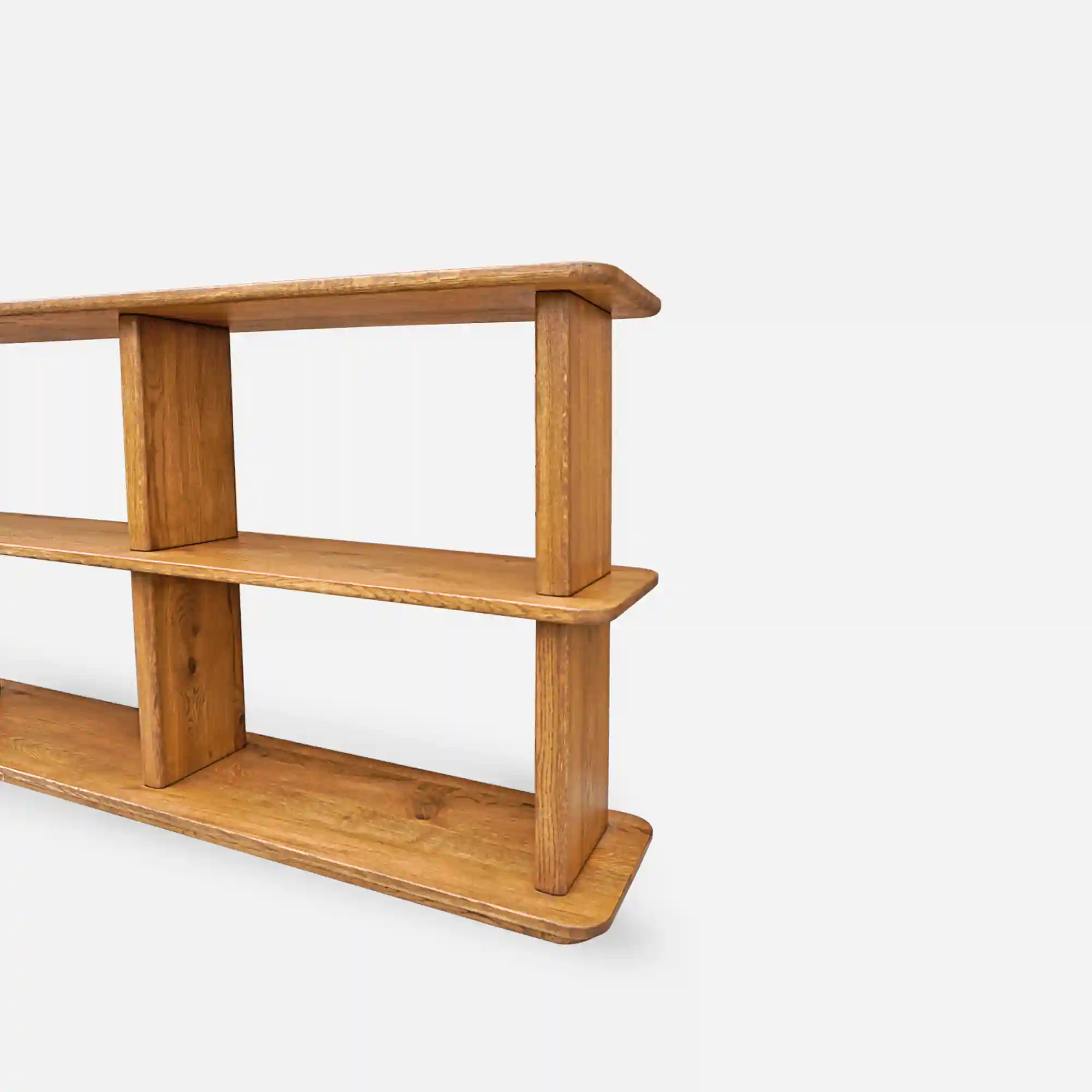 Regał dębowy TERIN to wyjątkowy mebel, który łączy w sobie elegancję naturalnego drewna i ponadczasowy design. Wykonany z litego drewna dębowego i wykończony olejem w kolorze orzech, zachwyca ciepłym odcieniem oraz piękną strukturą słojów. Model TERIN charakteryzuje się przemyślaną konstrukcją – otwarte półki zapewniają łatwy dostęp do książek, dekoracji czy dokumentów, a subtelnie zaokrąglone krawędzie podkreślają jego nowoczesny charakter, dodają mu lekkości i bezpieczeństwa. Ten regał drewniany idealnie sprawdzi się w salonie, gabinecie, bibliotece czy biurze, oferując dużą przestrzeń do przechowywania i organizacji. To stosunkowo niski regał dębowy o zaoblonych krawędziach, co czyni go idealnym rozwiązaniem do na przykład pokoju dziecięcego. Dzięki solidnej konstrukcji oraz wysokiej jakości surowcom jest to mebel trwały i odporny na upływ czasu.
