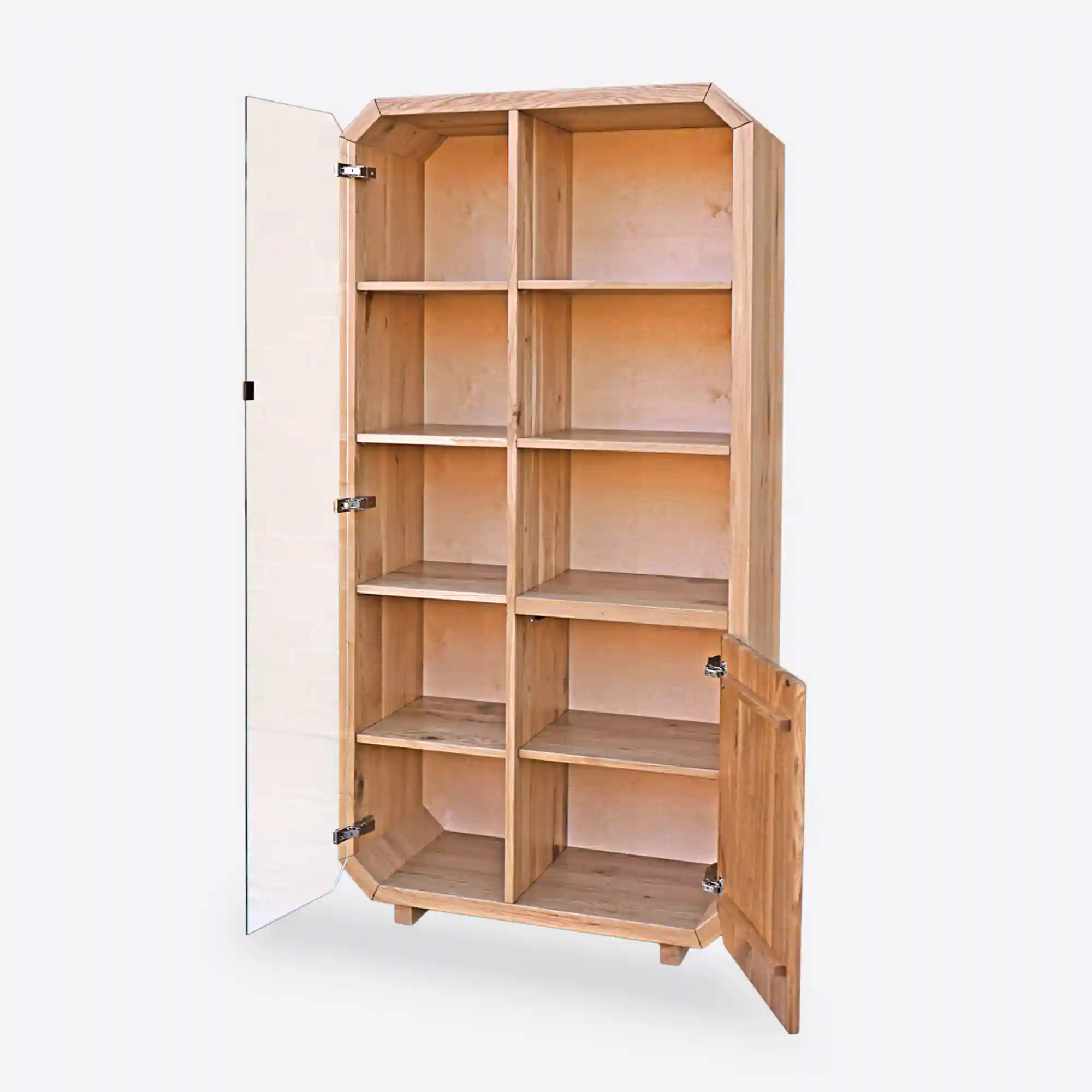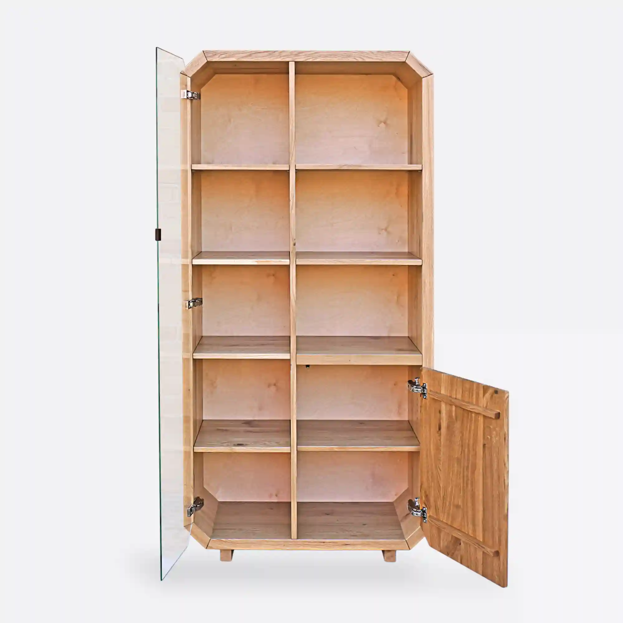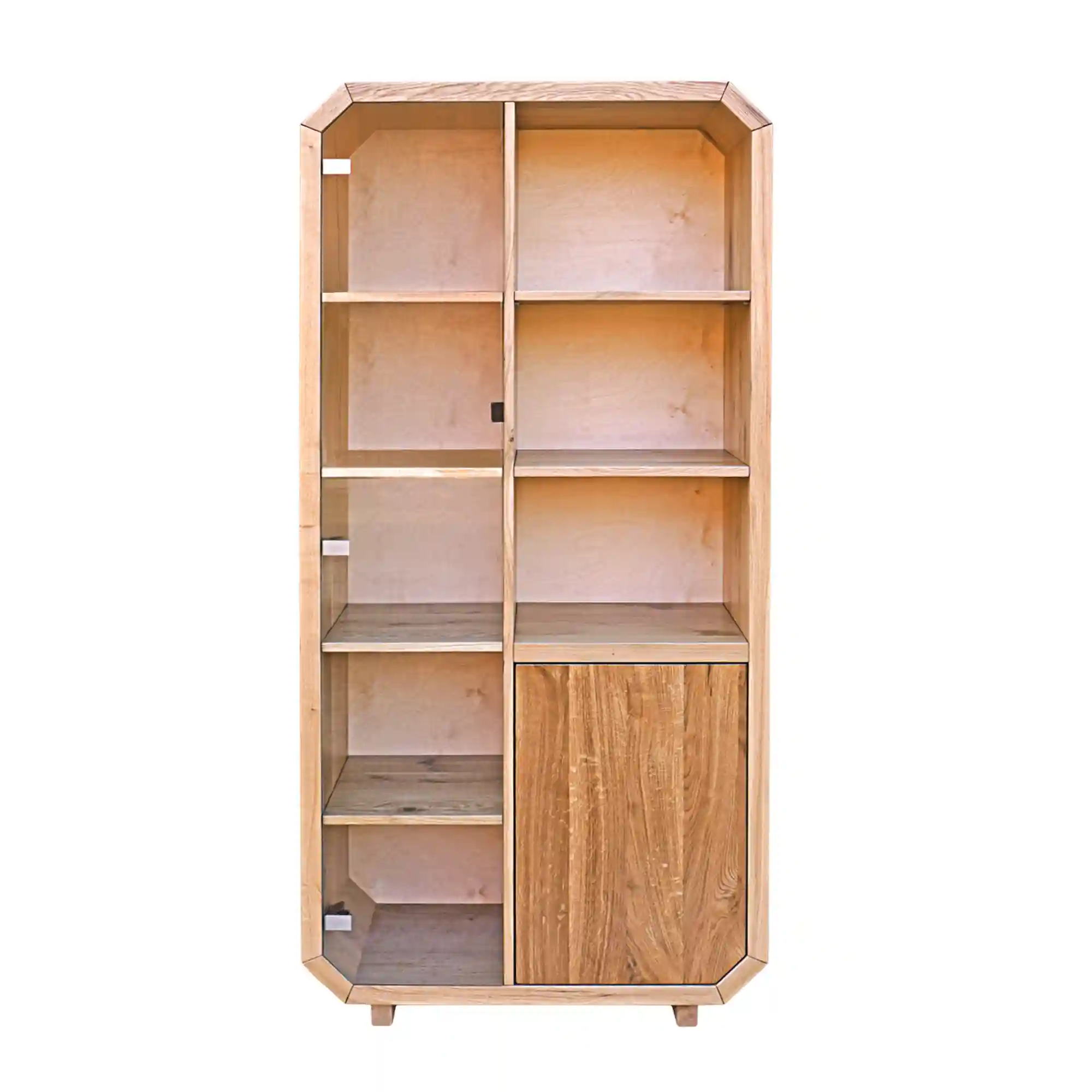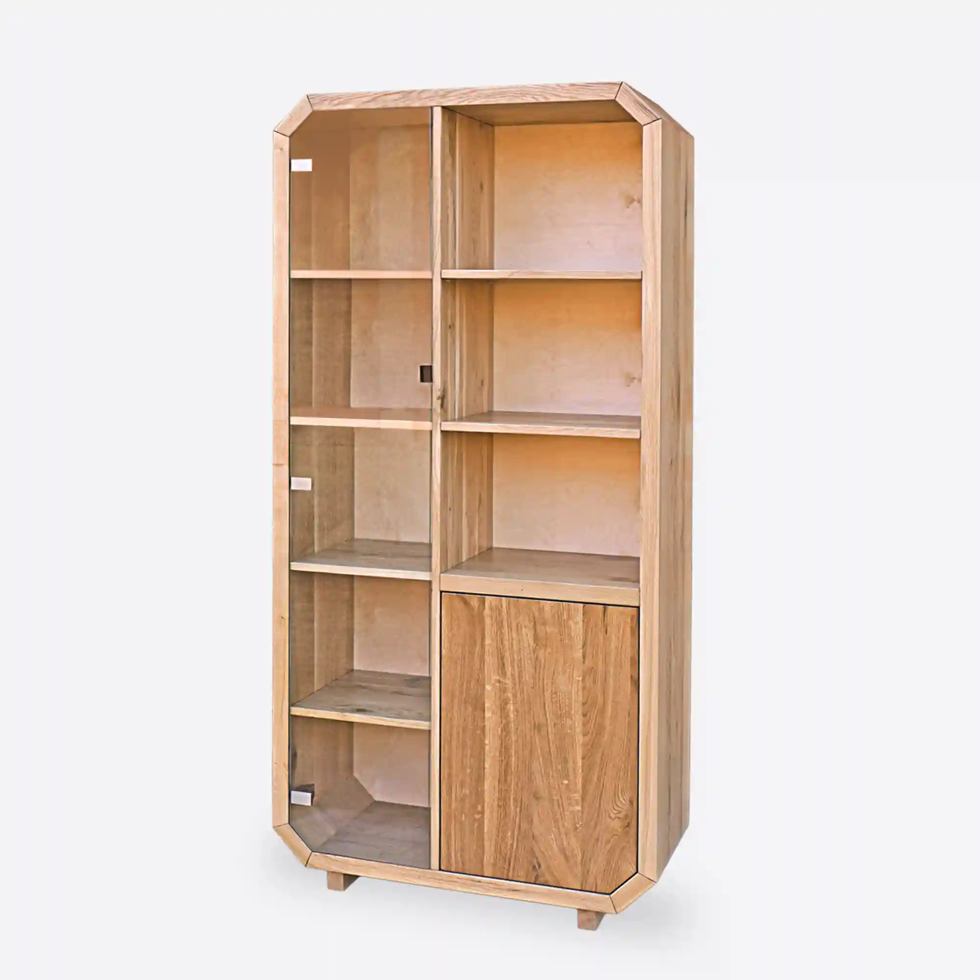 Słupek, regał na książki z drewna OMNIS wyprodukowano ręcznie z dbałością o jakość wykonania. Korpus mebla wykonano z dębowego drewna litego, natomiast front dolnej szafki ze starego drewna. Dzięki wykonaniu z drewna, słupek wprowadza do wnętrza ciepły i przytulny klimat. Natomiast szklane drzwiczki nadają całości lekkiego i otwartego charakteru. Rama mebla kształtem odwzorowuje oktagon, co nadaje meblu oryginalności, w porównaniu do innych. Drewniany regał posiada z lewej strony 4 półki, które są ukryte za czarnym szkłem. Natomiast z prawej strony znajdują się 3 otwarte półki, a poniżej szafka z półką w środku. Dzięki temu ten designerski regał jest bardzo funkcjonalny i pojemny i pozwoli na lepszą organizację w pomieszczeniu. Słupek, regał na książki z drewna OMNIS stanowić będzie uzupełnienie każdego pomieszczenia, ze względu na swą praktyczną formę oraz pojemność.
