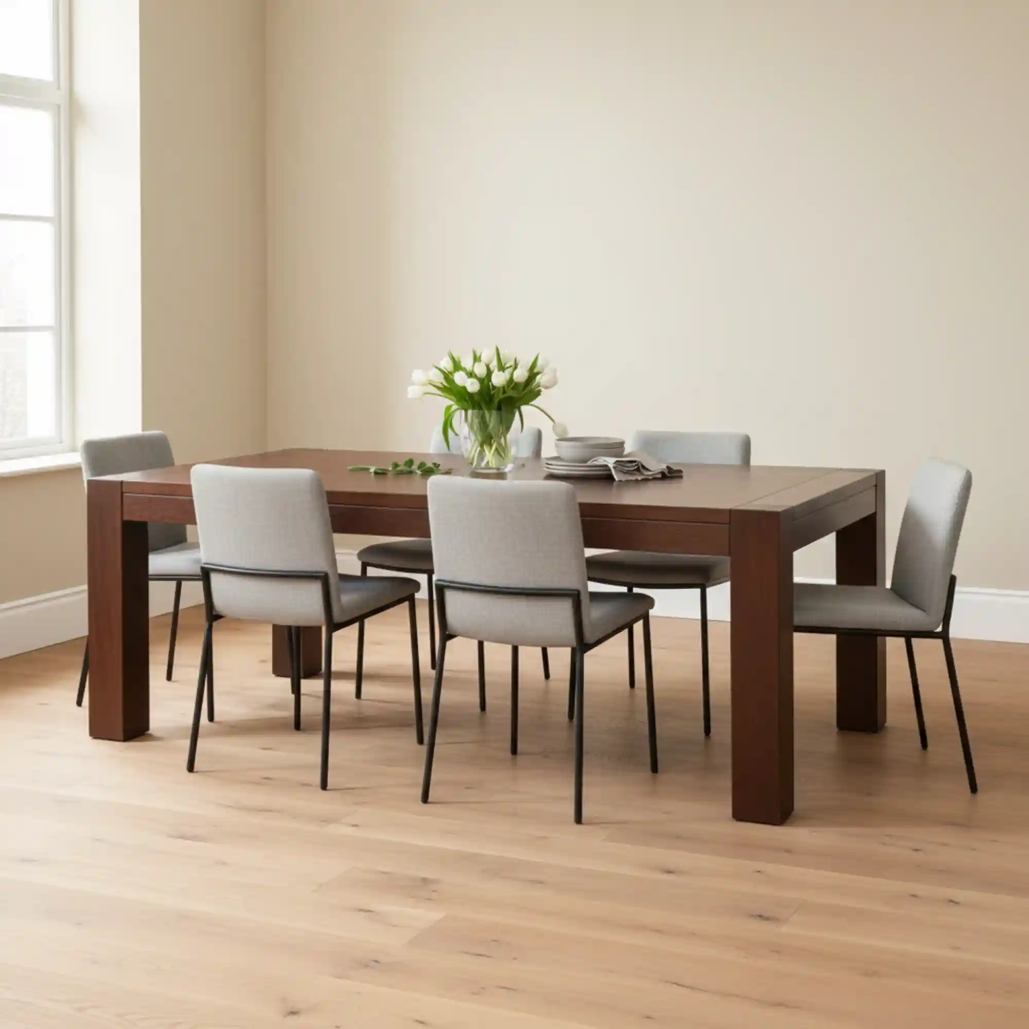 Wykończenie stołu z litego drewna na wymiar możesz wybrać spośród różnych opcji. Kolor drewna dostosowujemy poprzez naturalne oleje podkreślające strukturę drewna, różne odcienie bejc (od jasnego dębu naturalnego, przez miodowe tony, aż po ciemny orzech czy wenge) oraz lakiery matowe lub półmatowe chroniące powierzchnię. Każde wykończenie uwydatnia naturalne piękno drewna, zachowując jego unikalny charakter.Kolor stali w metalowych nogach również jest w pełni personalizowany – czarny mat (najpopularniejszy w stylu industrialnym), stal szczotkowana (elegancka i nowoczesna), biały RAL (skandynawski minimalizm), grafit, złoty akcent czy dowolny inny kolor według palety RAL. Możliwe jest również wykonanie nóg z litego drewna dębowego w tym samym wykończeniu co blat, co tworzy spójną, harmonijną całość.Zastosowanie dostawek rozkładanych to praktyczne rozwiązanie dla osób, które potrzebują elastyczności. Stół rozkładany na wymiar może być wyposażony w jeden lub dwa wkłady, które są przechowywane pod konstrukcją stołu lub oddzielnie (w zależności od wybranego modelu). System rozkładania projektujemy tak, aby był łatwy w obsłudze – zazwyczaj stosujemy płynne prowadnice, które pozwalają na bezwysiłkowe rozsuwanie blatu.Rodzaje Stołów na Wymiar - Wybierz Odpowiedni dla Siebie