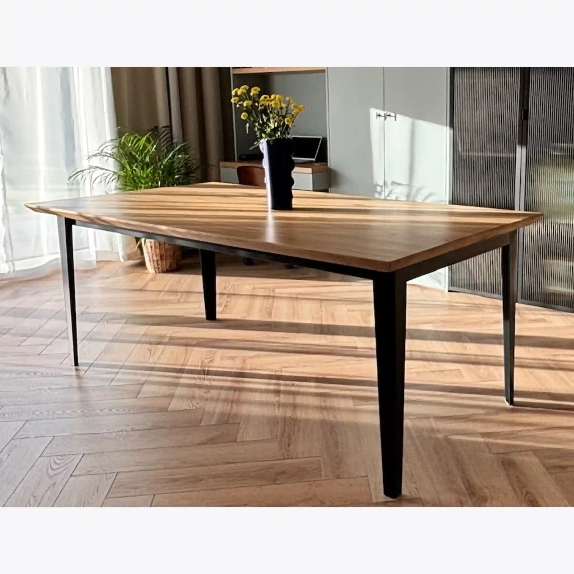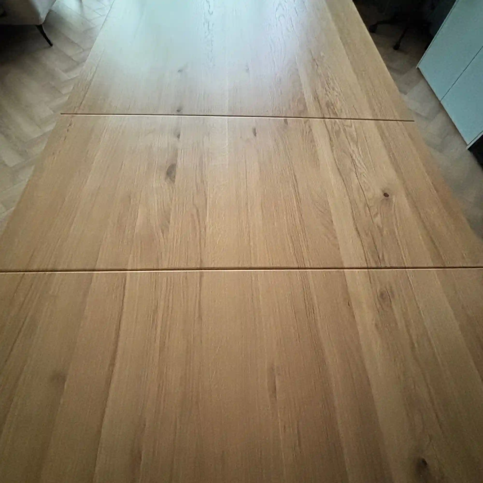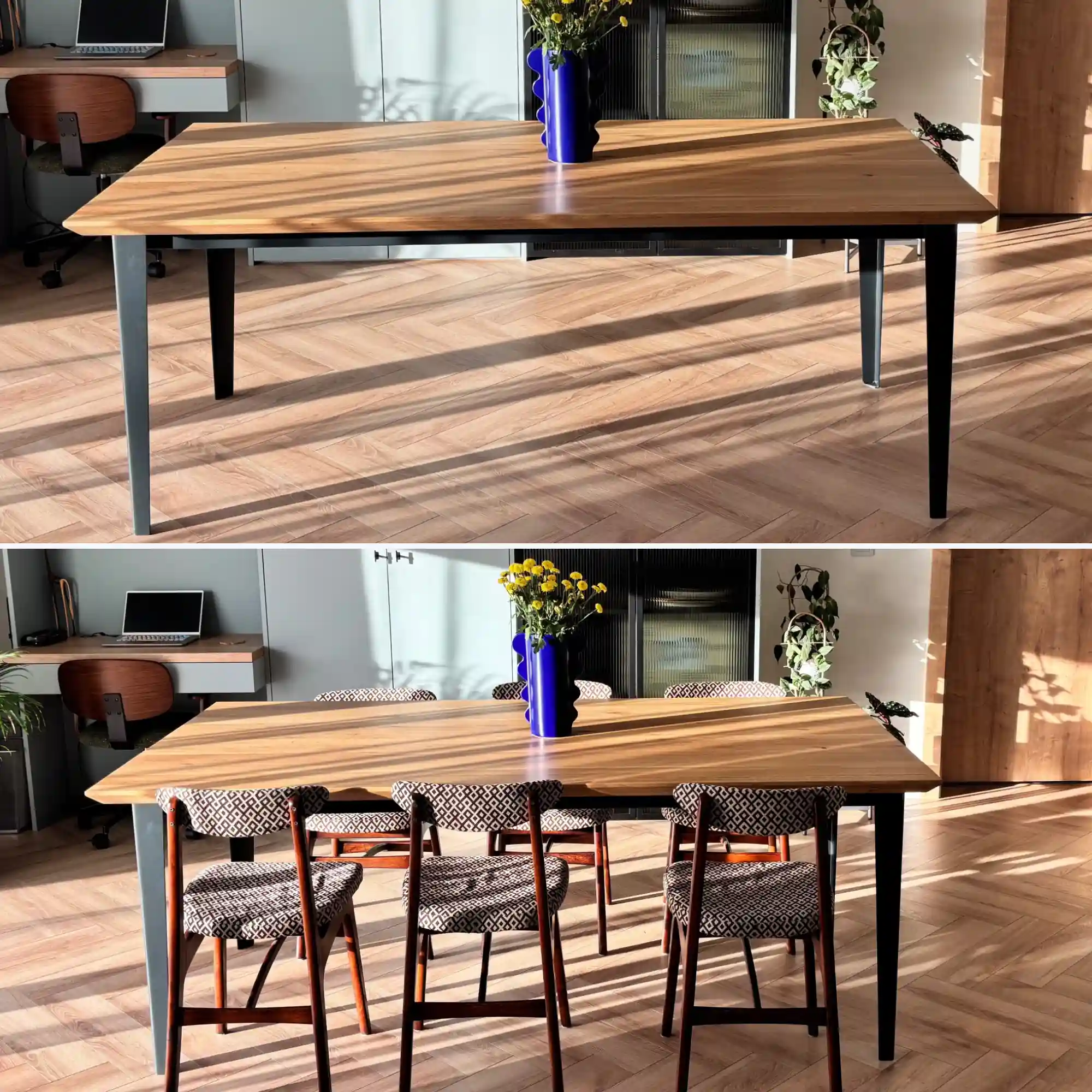 Wykończenie stołu z litego drewna na wymiar możesz wybrać spośród różnych opcji. Kolor drewna dostosowujemy poprzez naturalne oleje podkreślające strukturę drewna, różne odcienie bejc (od jasnego dębu naturalnego, przez miodowe tony, aż po ciemny orzech czy wenge) oraz lakiery matowe lub półmatowe chroniące powierzchnię. Każde wykończenie uwydatnia naturalne piękno drewna, zachowując jego unikalny charakter.Kolor stali w metalowych nogach również jest w pełni personalizowany – czarny mat (najpopularniejszy w stylu industrialnym), stal szczotkowana (elegancka i nowoczesna), biały RAL (skandynawski minimalizm), grafit, złoty akcent czy dowolny inny kolor według palety RAL. Możliwe jest również wykonanie nóg z litego drewna dębowego w tym samym wykończeniu co blat, co tworzy spójną, harmonijną całość.Zastosowanie dostawek rozkładanych to praktyczne rozwiązanie dla osób, które potrzebują elastyczności. Stół rozkładany na wymiar może być wyposażony w jeden lub dwa wkłady, które są przechowywane pod konstrukcją stołu lub oddzielnie (w zależności od wybranego modelu). System rozkładania projektujemy tak, aby był łatwy w obsłudze – zazwyczaj stosujemy płynne prowadnice, które pozwalają na bezwysiłkowe rozsuwanie blatu.Rodzaje Stołów na Wymiar - Wybierz Odpowiedni dla Siebie