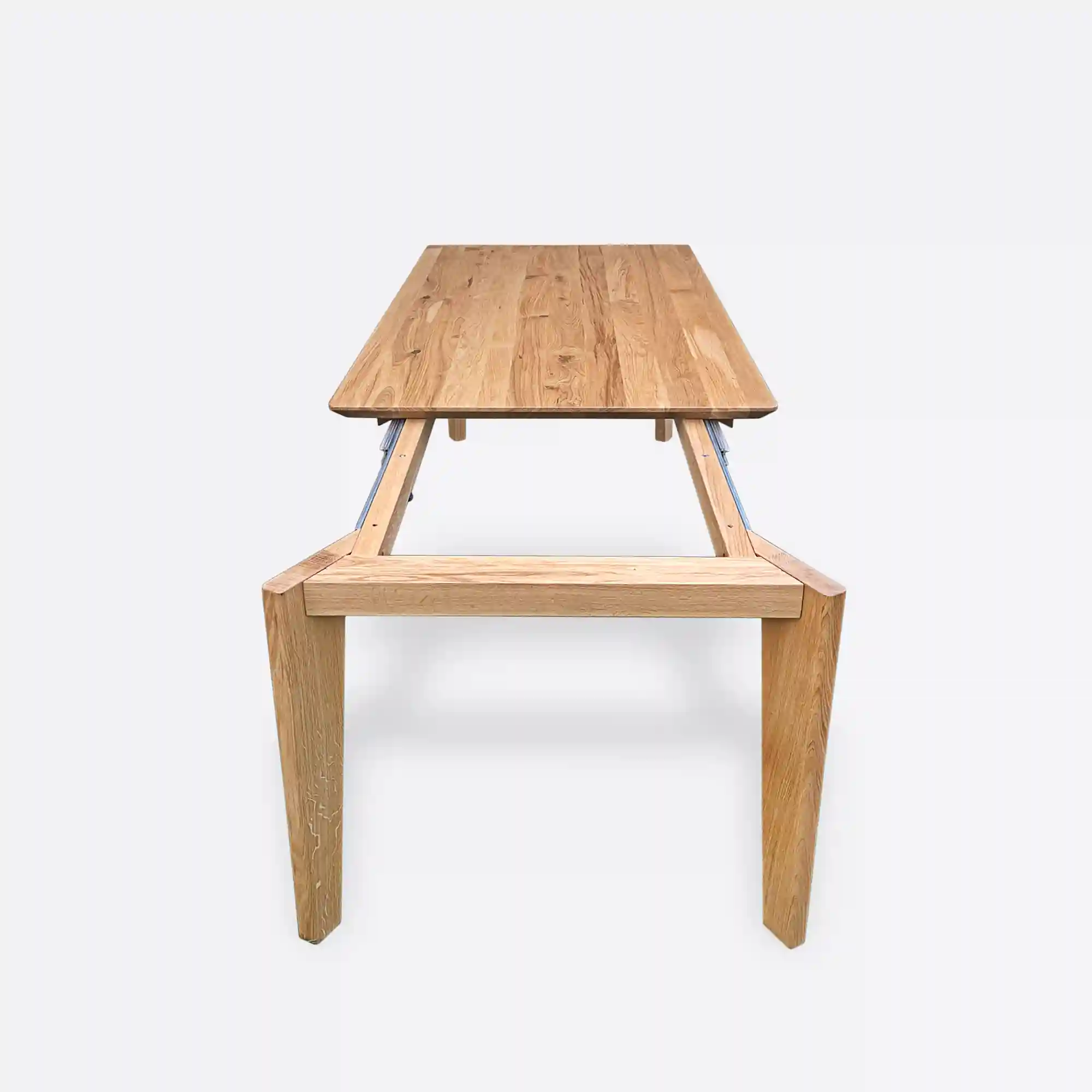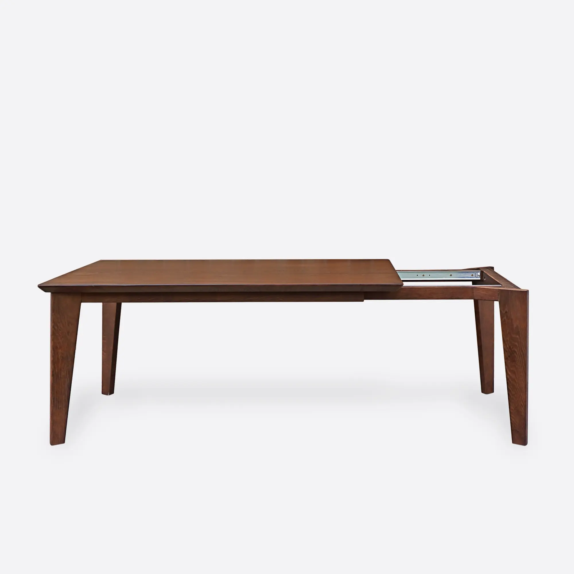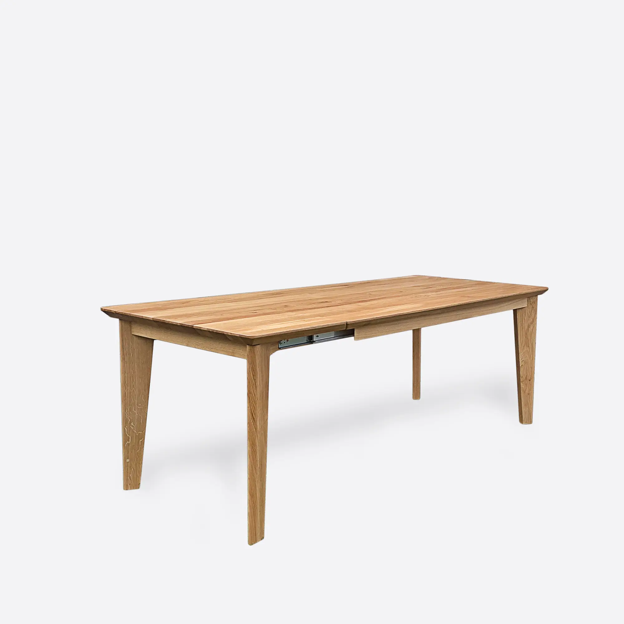 Wykończenie stołu z litego drewna na wymiar możesz wybrać spośród różnych opcji. Kolor drewna dostosowujemy poprzez naturalne oleje podkreślające strukturę drewna, różne odcienie bejc (od jasnego dębu naturalnego, przez miodowe tony, aż po ciemny orzech czy wenge) oraz lakiery matowe lub półmatowe chroniące powierzchnię. Każde wykończenie uwydatnia naturalne piękno drewna, zachowując jego unikalny charakter.Kolor stali w metalowych nogach również jest w pełni personalizowany – czarny mat (najpopularniejszy w stylu industrialnym), stal szczotkowana (elegancka i nowoczesna), biały RAL (skandynawski minimalizm), grafit, złoty akcent czy dowolny inny kolor według palety RAL. Możliwe jest również wykonanie nóg z litego drewna dębowego w tym samym wykończeniu co blat, co tworzy spójną, harmonijną całość.Zastosowanie dostawek rozkładanych to praktyczne rozwiązanie dla osób, które potrzebują elastyczności. Stół rozkładany na wymiar może być wyposażony w jeden lub dwa wkłady, które są przechowywane pod konstrukcją stołu lub oddzielnie (w zależności od wybranego modelu). System rozkładania projektujemy tak, aby był łatwy w obsłudze – zazwyczaj stosujemy płynne prowadnice, które pozwalają na bezwysiłkowe rozsuwanie blatu.Rodzaje Stołów na Wymiar - Wybierz Odpowiedni dla Siebie