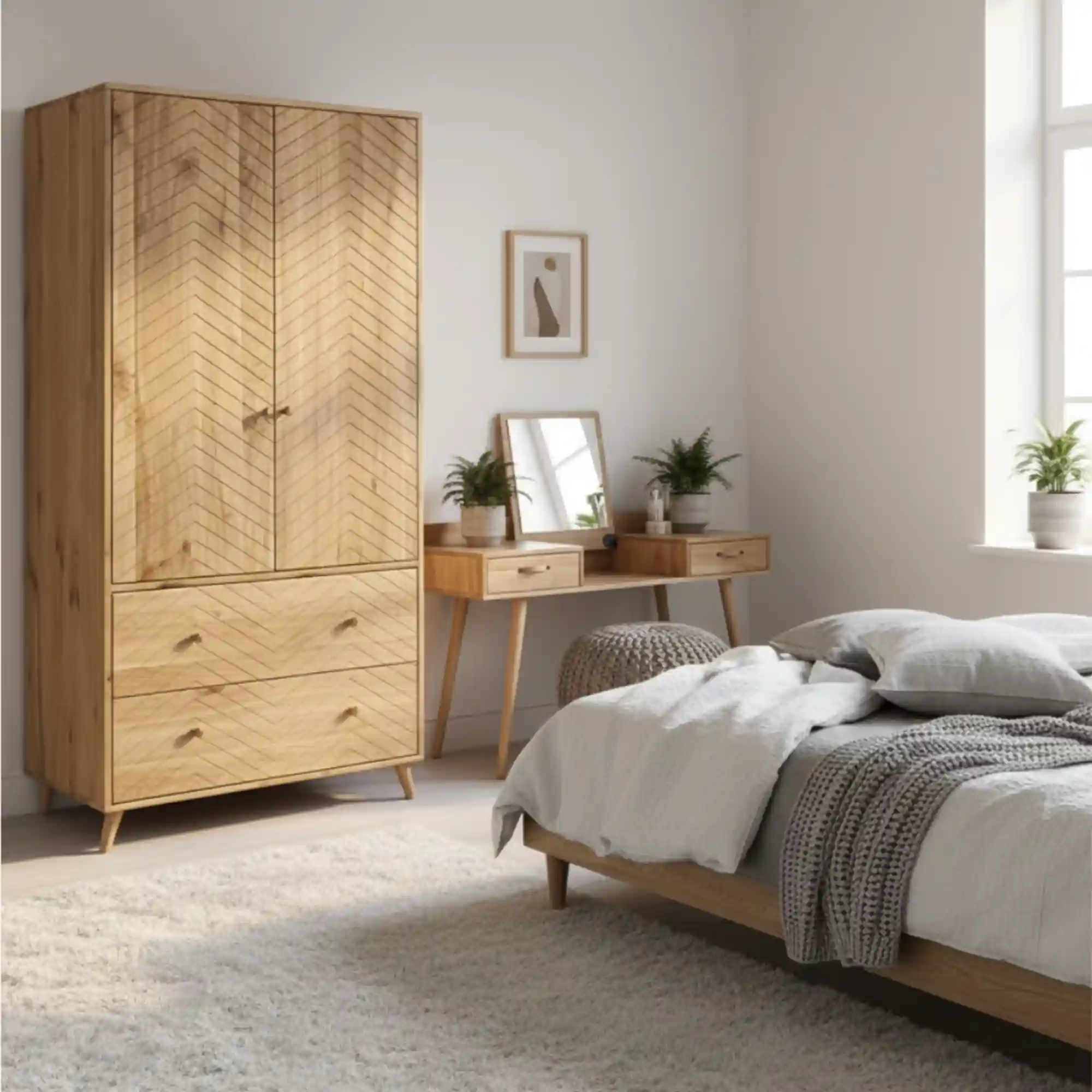Dębowa szafa AXEL na nóżkach to wyjątkowy mebel o klasycznym charakterze, który łączy w sobie elegancję i funkcjonalność. Górna część szafy została podzielona na dwie strefy – jedna z nich wyposażona jest w drążek na ubrania i dodatkową półkę, natomiast w drugiej znajdują się praktyczne półki. Wnętrze zapewnia sporo miejsca do przechowywania ubrań i akcesoriów. Na dole znajdują się dwie przestronne szuflady, idealne do przechowywania drobnych przedmiotów czy bielizny. Delikatne drewniane uchwyty doskonale komponują się z naturalnym kolorem drewna dębowego, który podkreśla prostą, a zarazem ponadczasową formę szafy. Szafa z frezowanymi frontami to wyjątkowy element wyposażenia, który wprowadza do wnętrza elegancję i subtelny charakter. Dzięki starannie wykonanym frezom, fronty szafy zyskują oryginalną fakturę, która przyciąga wzrok i nadaje meblowi wyrafinowanego stylu. Taki detal sprawia, że wnętrze nabiera niepowtarzalnego wyglądu, łącząc w sobie nowoczesność z nutą klasyki. Frezowane fronty świetnie komponują się z różnymi aranżacjami – od minimalistycznych, przez skandynawskie, aż po bardziej glamour. Szafa AXEL to doskonały wybór dla osób, które cenią nietuzinkowe rozwiązania i chcą dodać swojemu wnętrzu elegancki, a jednocześnie nowoczesny akcent.