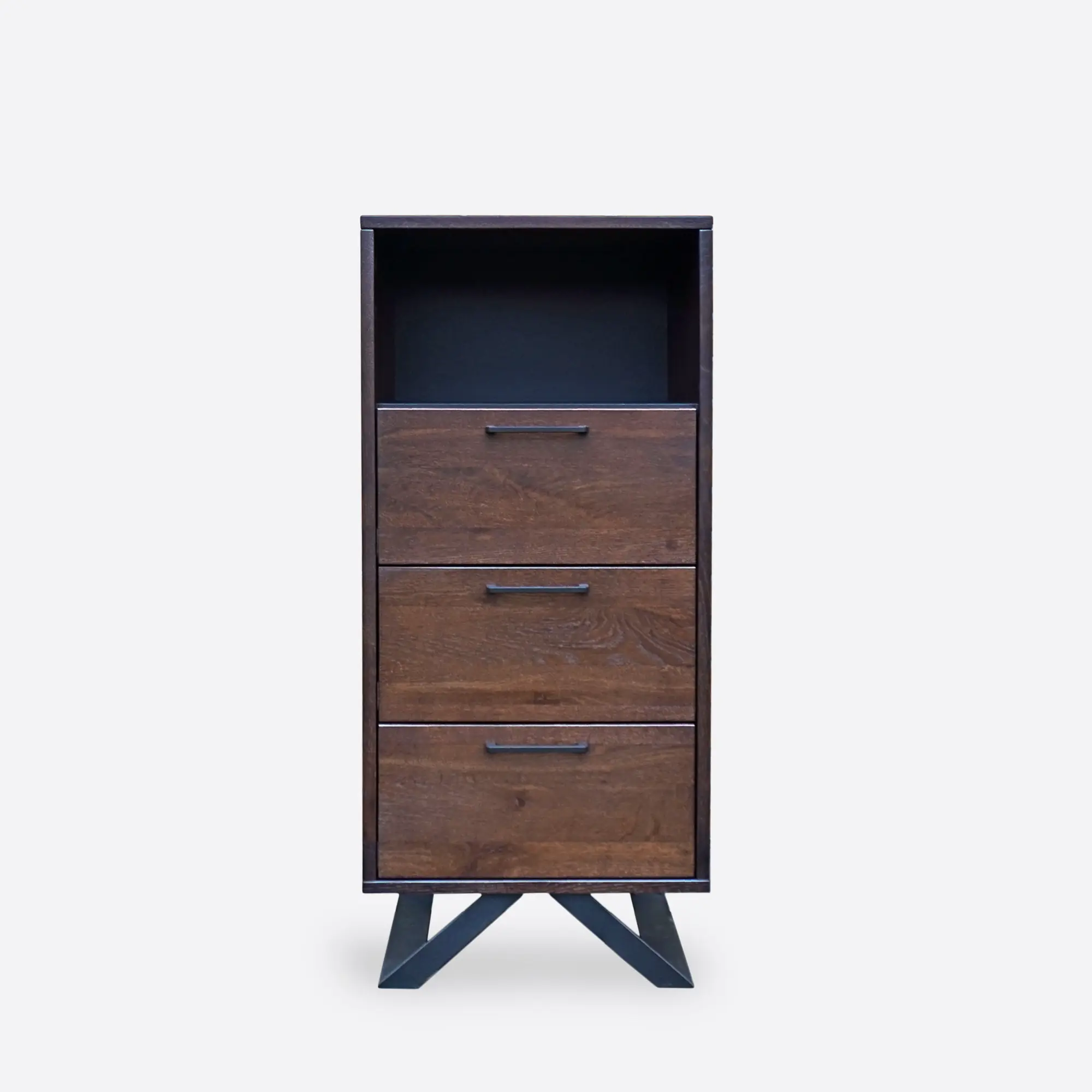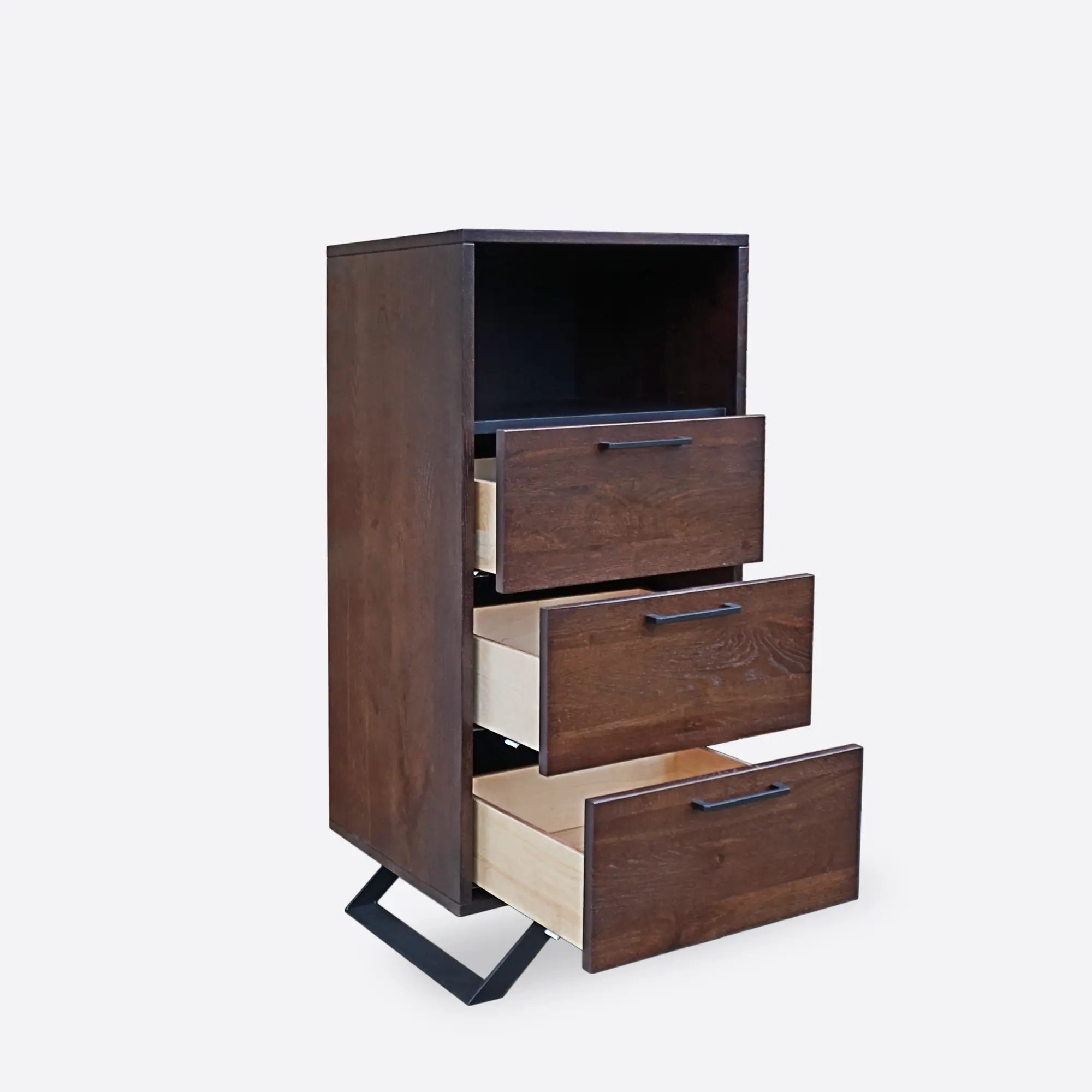 Szafka dębowa z szufladami JORGEN doskonale sprawdzi się w salonie, gabinecie lub sypialni. Drewnianą komodę wykonano z naturalnego dębowego drewna litego, dzięki czemu jest trwała i może służyć przez wiele lat. Piękny i niepowtarzalny rysunek drewna dębowego sprawia, że mebel świetnie odnajdzie się w każdym wnętrzu. Ponadto możliwy jest wybór innego koloru drewna lub stali, co pozwoli perfekcyjnie dopasować mebel do Państwa aranżacji. Natomiast nogi wykonano ze stali pomalowanej proszkowo na kolor czarny. Malowanie proszkowe sprawia, że stal jest całkowicie odporna na korozję i powoduje powstanie warstwy barwnej, którą bardzo trudno jest uszkodzić. Dębowy słupek wyposażono w trzy pojemne szuflady, dzięki czemu zapewni sporo miejsca do przechowywania. Szafka dębowa z szufladami JORGEN wykonano ręcznie, dzięki czemu każdy szczegół dopracowany jest do perfekcji.