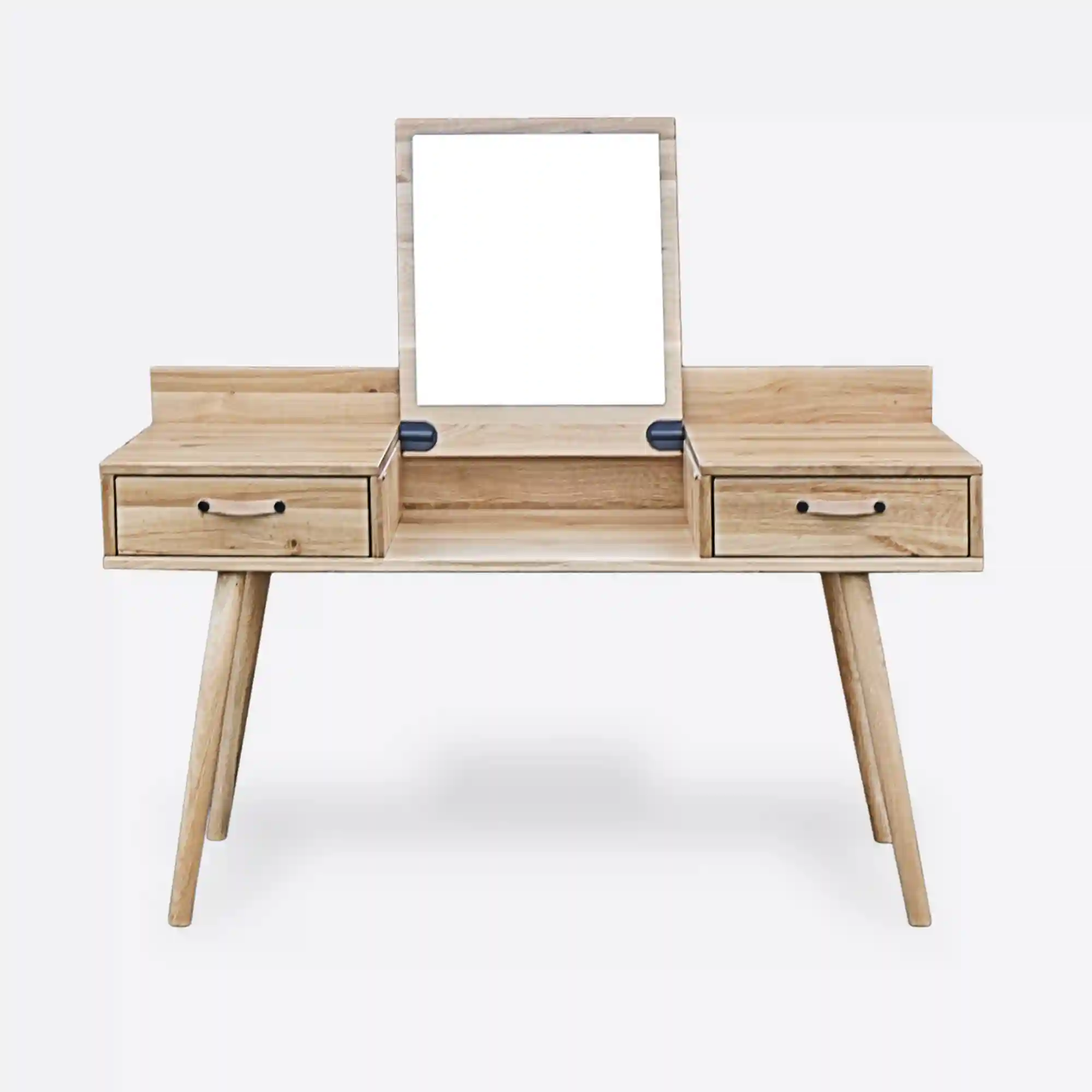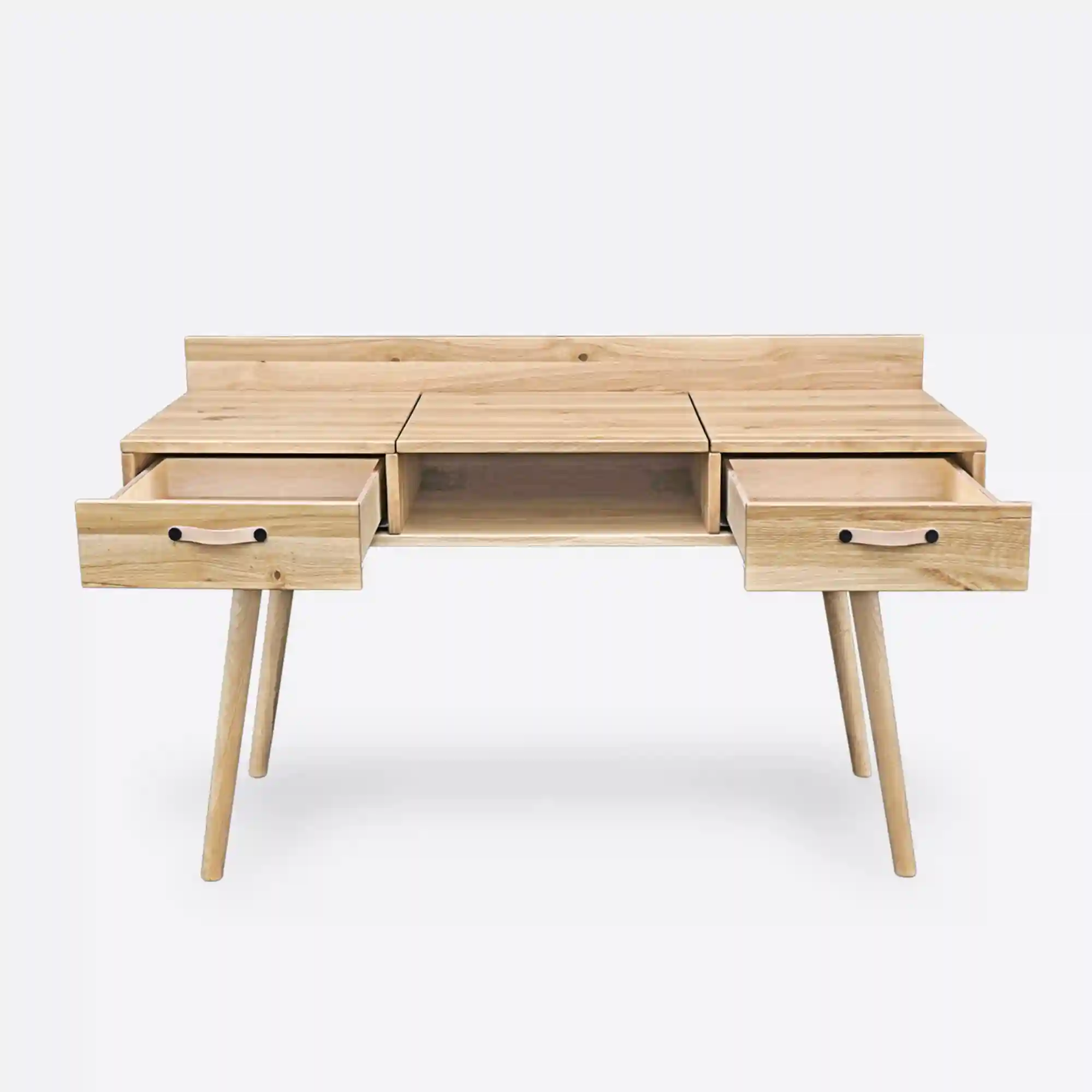 Toaletka dębowa/biurko AXEL to nowoczesny mebel wielozadaniowy, który z łatwością dopasujesz do swojej codzienności. Toaletkę wykonaliśmy z naturalnego drewna dębowego. Dzięki czemu wnosi do wnętrza ciepło, charakter i klasę. Mebel zachwyca solidnym wykonaniem i ponadczasową estetyką. Toaletka drewniana została zaprojektowana z myślą o codziennym komforcie – środkowa część blatu unosi się na zawiasach, ukazując eleganckie lustro, idealne do makijażu czy codziennej rutyny beauty. Pod podnoszonym blatem znajduje się praktyczna wnęka na kosmetyki i akcesoria. Natomiast dwie pojemne szuflady z eleganckimi uchwytami ze skóry pozwalają na uporządkowane przechowywanie drobiazgów. Całość stoi na subtelnych, toczonych nogach z litego drewna, co nadaje meblowi lekkości i klasy. Biurko designerskie AXEL sprawdzi się nie tylko do codziennej pielęgnacji – dzięki minimalistycznej formie i wygodnej powierzchni roboczej, z powodzeniem może pełnić funkcję biurka. To doskonałe rozwiązanie do sypialni, garderoby czy domowego biura.