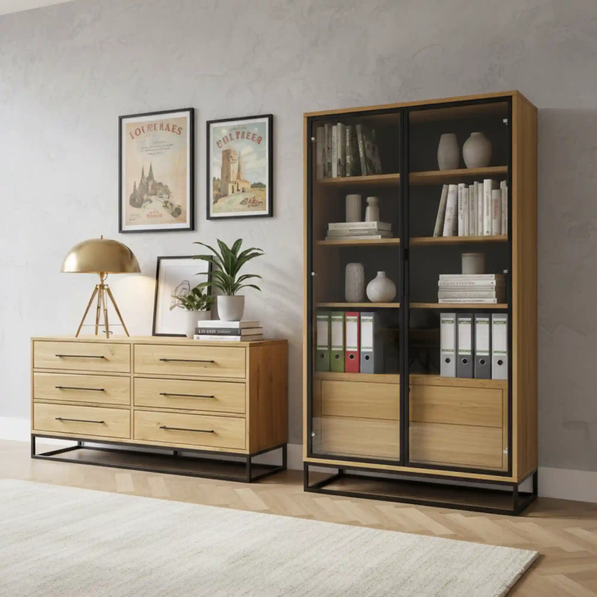 Witryna dębowa loft z litego drewna MERIS II niepowtarzalny design i ciekawa forma w nowoczesnym wydaniu. Drewniana witryna wykonana została z litego drewna dębowego o naturalnym, ciepłym kolorze. Dzięki temu struktura drewna jest wyraźnie widoczna, a ponadto każdy mebel zyskuje unikatowy charakter. Loftowa witryna z szufladami posiada metalowe elementy, wykonane ze stali malowanej proszkowo na czarno. Metalowe elementy kontrastują z naturalnym materiałem, a przy tym sprawiają, że mebel zyskuje prawdziwie industrialny charakter. Szuflady otwierane są za pomocą otworów we frontach. Drzwi witryny wykonano ze szkła z metalową ramką w kolorze czarnym. Wykonana z litego drewna witryna zapewni Ci dużo miejsca do ekspozycji Twoich pamiątek, dekoracji lub przechowywania książek, segregratorów w gabinecie. Witryna dębowa loft MERIS II sprawdzi się doskonale do wnętrz nowoczesnych, industrialnych i loftowych.