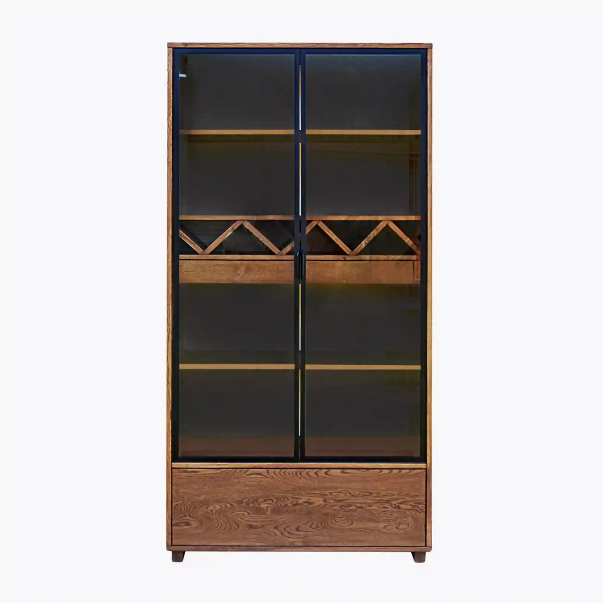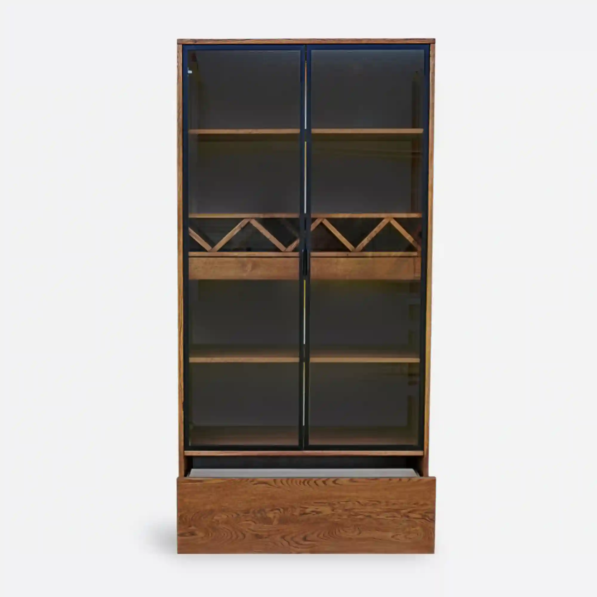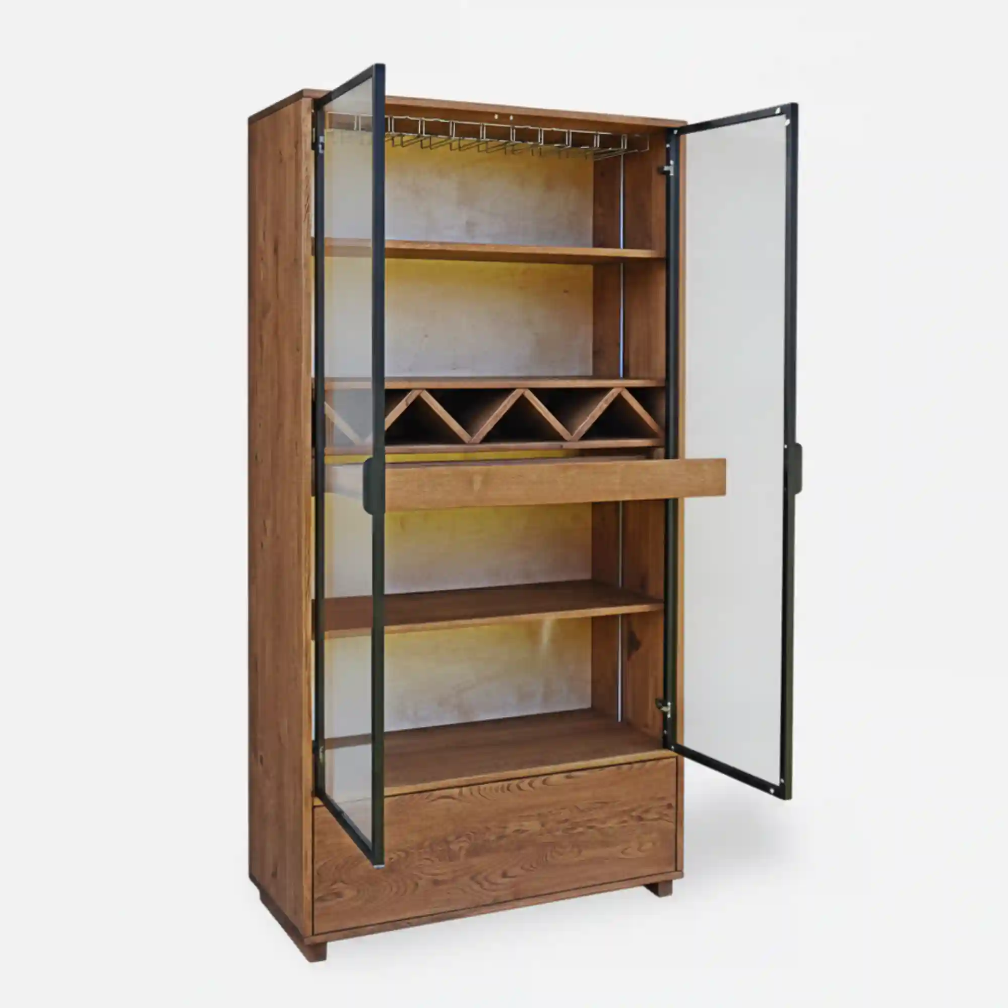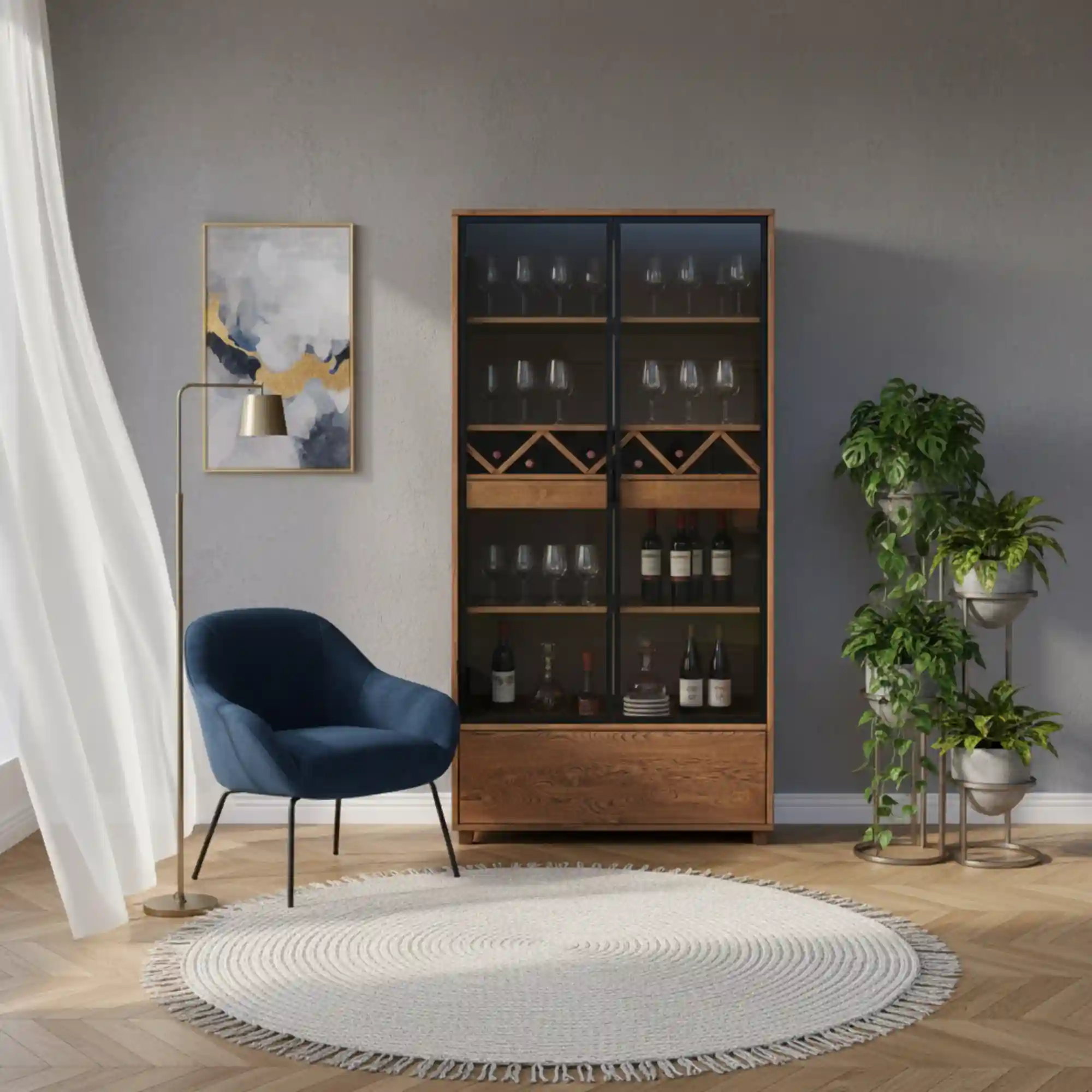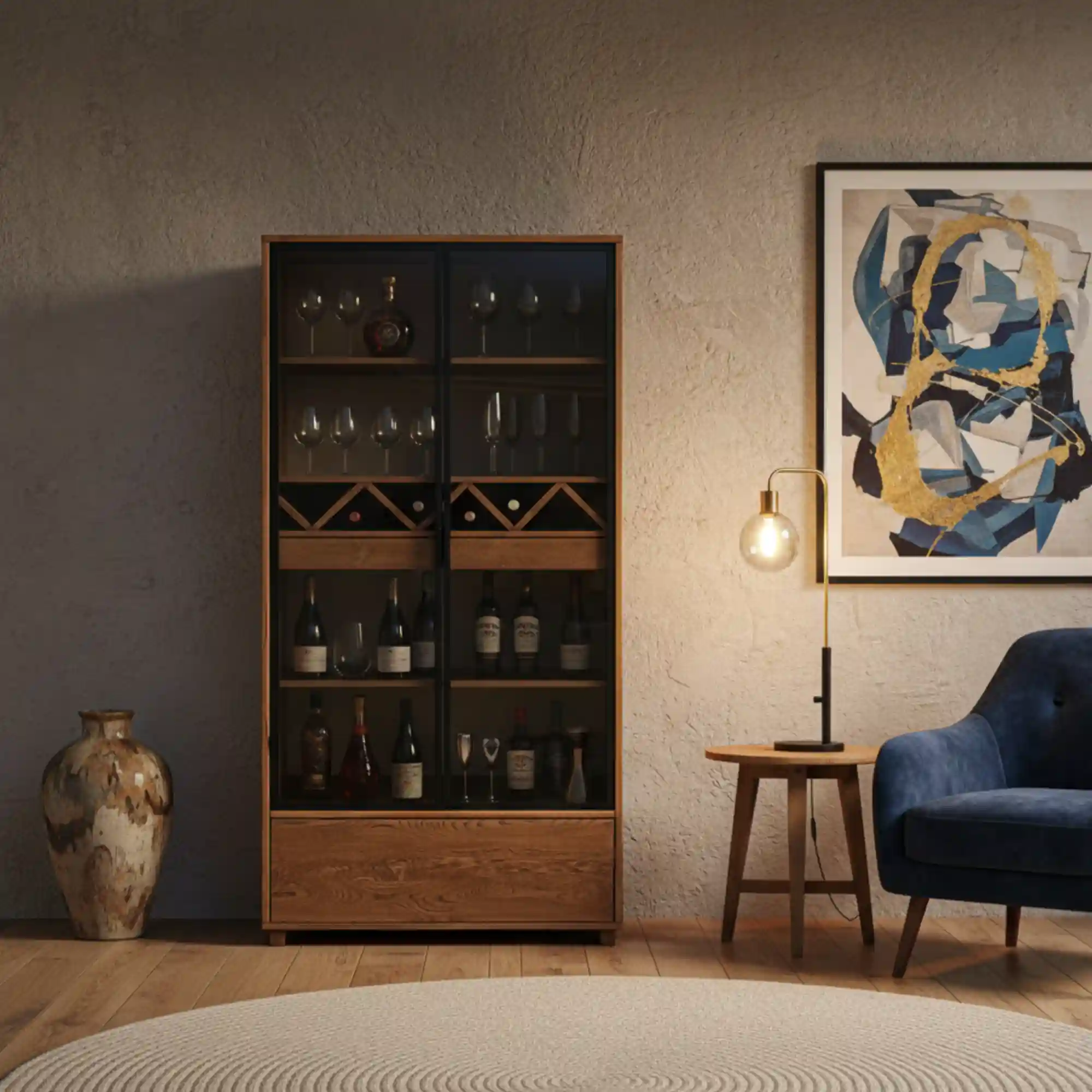 W RaWood traktujemy witrynę nie jako „zamkniętą szafkę ze szkłem”, ale jako mebel, który ma pracować w Twoim domu każdego dnia. Dlatego projektujemy witryny do salonu tak, by łączyły ekspozycję z realną funkcjonalnością: część rzeczy może być wyeksponowana, a część wygodnie schowana. MERIS V jest świetnym przykładem takiego podejścia – może być klasyczną witryną na szkło i dekoracje, ale też dopracowaną witryną na alkohole z miejscem na butelki, kieliszki i serwowanie. W zależności od tego, jak zaaranżujesz półki, ten sam mebel sprawdzi się do przechowywania książek, kolekcji, naczyń, porcelany albo domowego barku – bez utraty estetyki.
