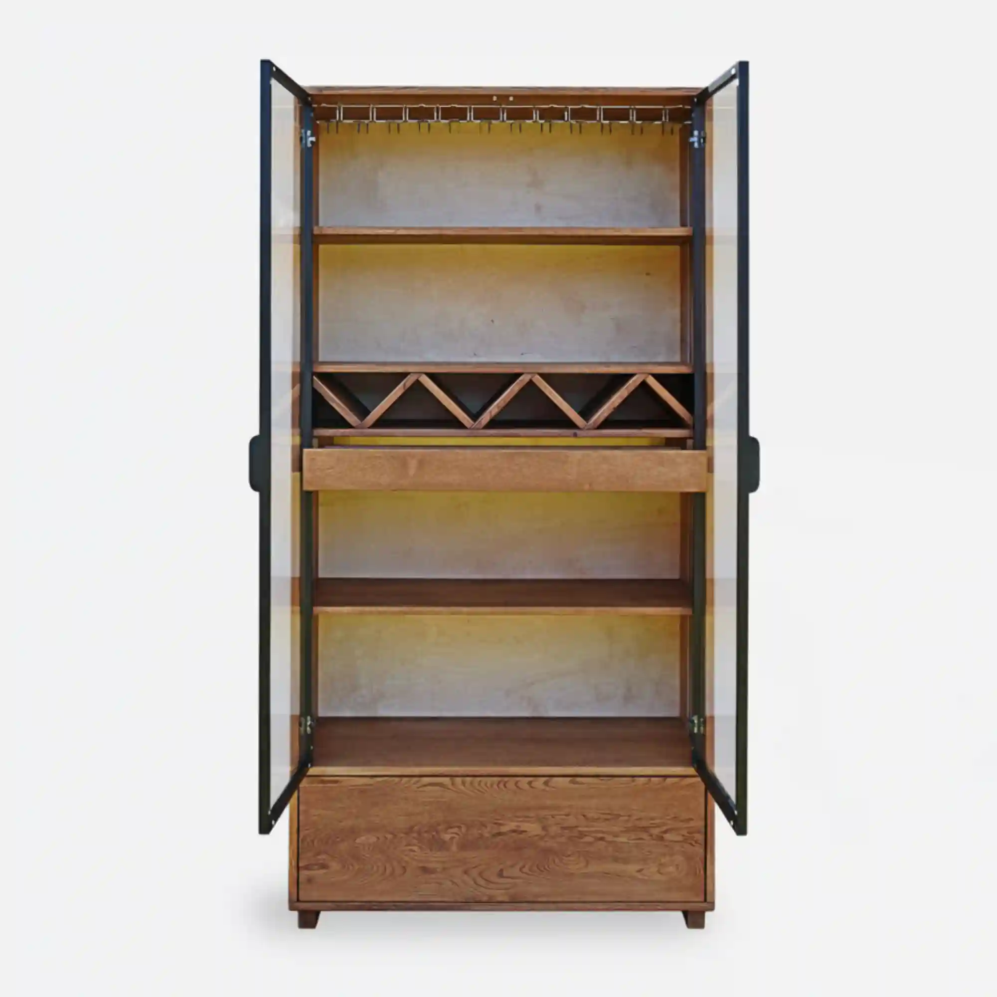Najważniejsza zmiana w MERIS V kryje się we wnętrzu – pojawiają się tu elementy stworzone pod witryny na alkohole i komfort serwowania. Zastosowaliśmy efektowną przegrodę na butelki w formie zygzaka, która porządkuje kolekcję i tworzy wyrazisty detal widoczny także przez szkło. Nad strefą przechowywania przewidziane są wieszaki na kieliszki – dzięki nim szkło ma swoje miejsce, a jednocześnie jest łatwo dostępne podczas spotkań. Dodatkowo w witrynie znajduje się wysuwana półka, która działa jak dodatkowy blat roboczy: ułatwia nalewanie, przygotowanie i serwowanie trunków, bez zajmowania stołu czy komody. To detal, który realnie podnosi wygodę użytkowania, a przy tym nie zaburza eleganckiej formy mebla.