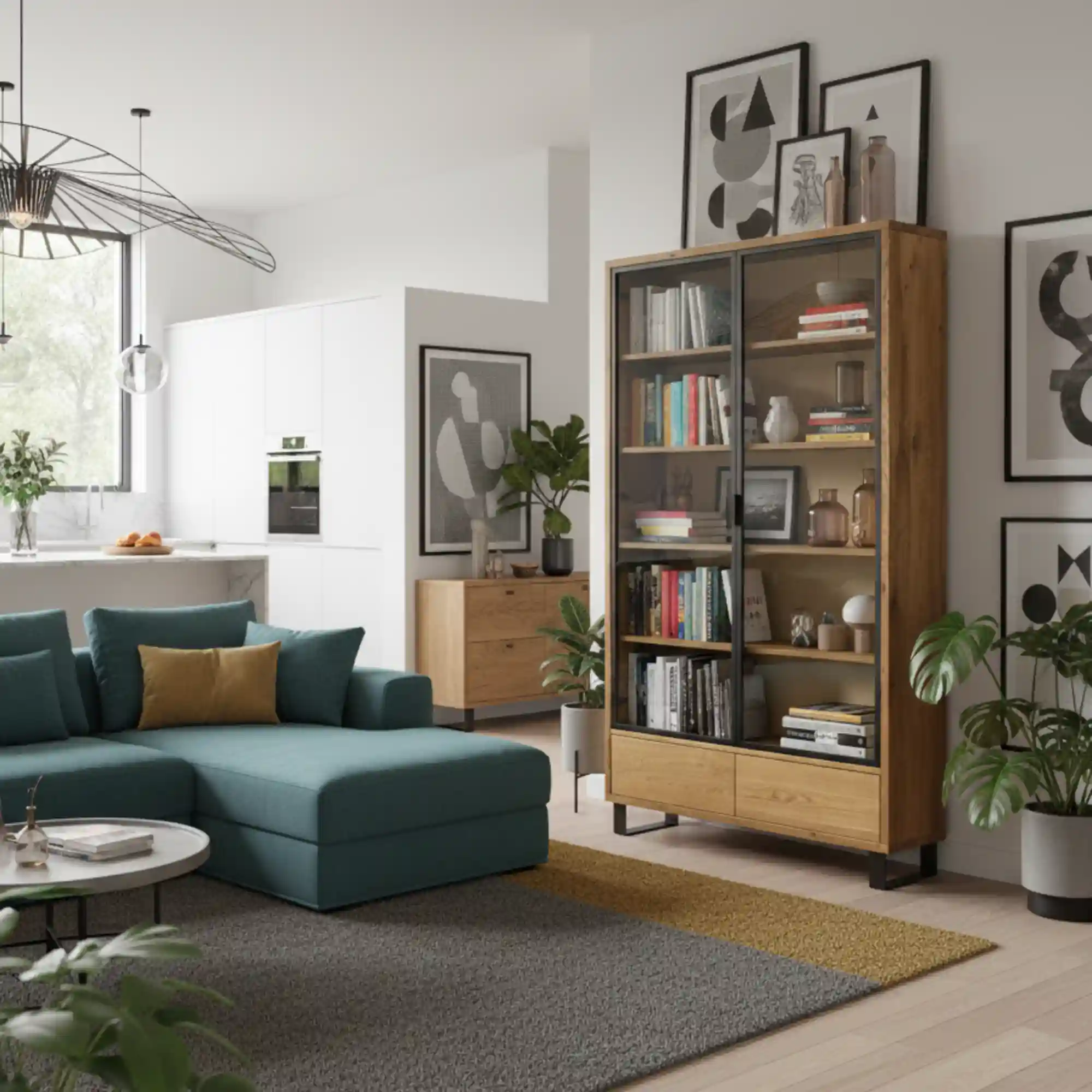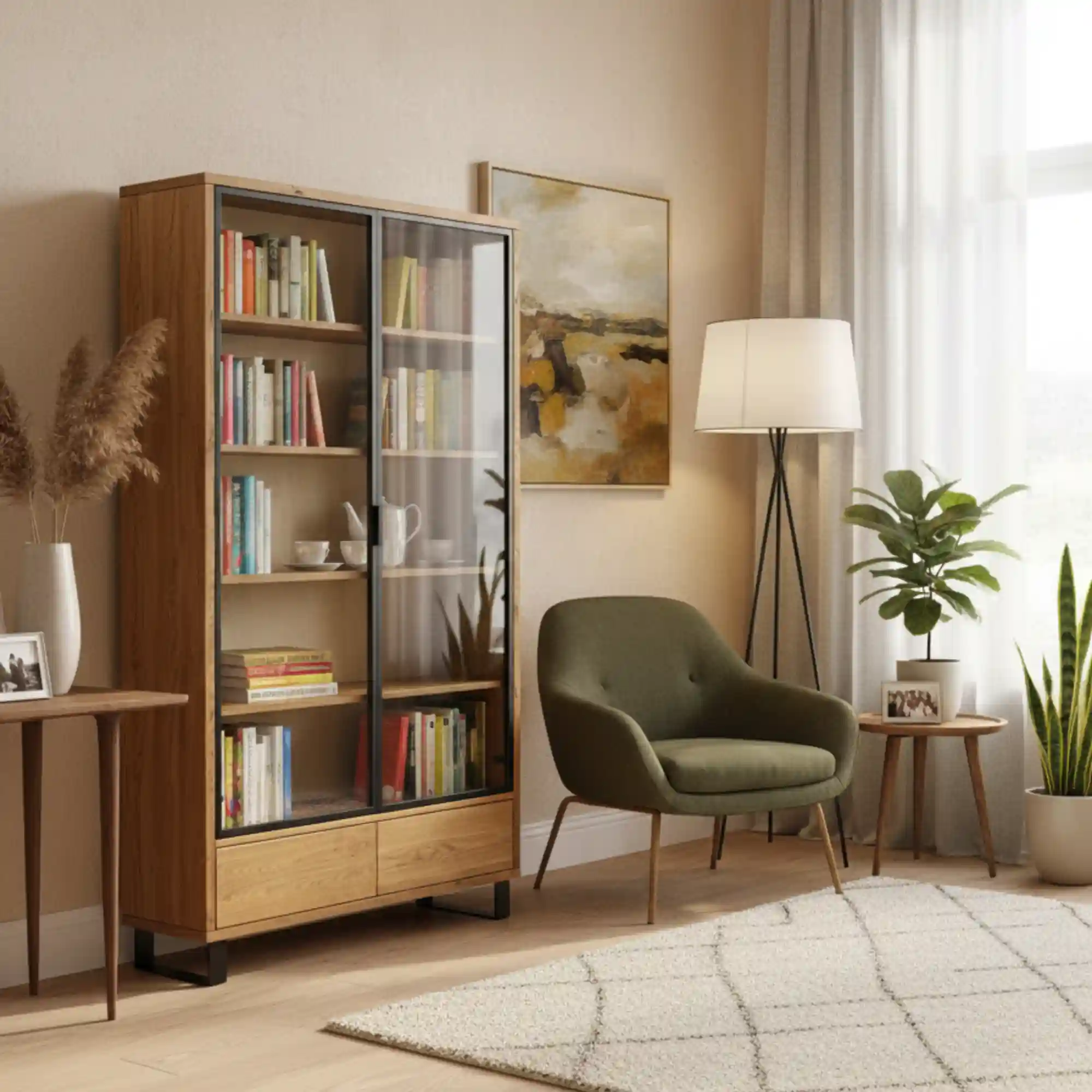Witryna drewniana DELIO IV wykonana jest z solidnego dębu i metalowych detali, co nadaje jej surowy, industrialny wygląd charakterystyczny dla stylu loftowego. Mebel ma prostą, geometryczną formę, bez zbędnych ozdobników. Drzwi wykonane są ze szkła, które zapewnia przeglądanie wnętrza witryny i eksponowanie jej zawartości. Witryna drewniana jest funkcjonalna, zapewniając wystarczającą przestrzeń do przechowywania. Może to być idealne miejsce na Twoją zastawę stołową, kieliszki lub naczynia, które pięknie się prezentują na dębowych półkach. Stabilne półki wykonane z dębu oferują dużo miejsca do ustawienia książek, dekoracji czy zbiorów szklanych waz i kolekcji porcelany. Surowa, naturalna tekstura drewna nadaje meblowi autentyczności, jednocześnie dodając ciepła do przestrzeni. Model z dwiema szufladami z mechanizmem cichego domykania to dobry wybór na przechowywanie dokumentów lub przedmiotów, które chcemy ukryć. Takie rozwiązania wprowadzają ład w Twoim salonie. Witryna dębowa DELIO IV nie tylko pełni funkcję praktyczną, ale także stanowi wyrazisty element dekoracyjny, który nadaje pomieszczeniu niepowtarzalny charakter.